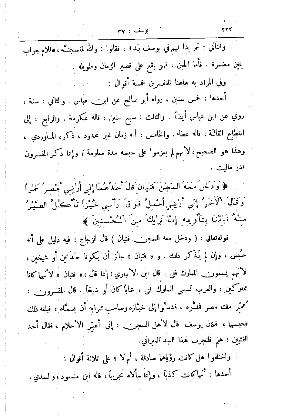 أحدها خمس سنين رواه أبو صالح عن ابن عباس والثاني سنة روي عن ابن عباس أيضا والثالث سبع سنين قاله عكرمة والرابع إلى انقطاع القالة قاله عطاء والخامس أنه زمان غير محدود ذكره الماوردي وهذا هو الصحيح لأنهم لم يعزموا على حبسه مدة معلومة وإنما ذكر المفسرون قدر مالبث ودخل معه السجن فتيان قال أحدها إني أريني أعصر خمرا وقال الآخر إني أريني أحمل فوق رأسي خبزا تأكل الطير منه نبئنا بتأويله إنانريك من المحسنين