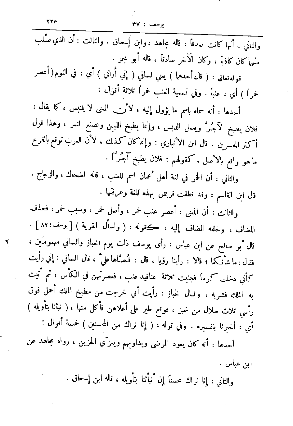 والثاني أن الخمر في لغة أهل عمان اسم للعنب قاله الضحاك والزجاج قال ابن القاسم وقد نطقت قريش بهذه اللغة وعرفتها والثالث أن المعنى أعصر عنب خمر وأصل خمر وسبب خمر فحذف المضاف وخلفه المضاف إليه كقوله واسأل القرية يوسف 82 قال أبو صالح عن عن ابن عباس رأى يوسف ذات يوم الخباز والساقي مهمومين فقال ما شأنكما قالا رأينا رؤيا قال قصاها علي قال الساقي إني رأيت كأني دخلت كرما فجنيت ثلاثة عناقيد عنب فعصرتهن في الكأس ثم أتيت به الملك فشربه وقال الخباز رايت أني خرجت من مطبخ الملك أحمل فوق رأسي ثلاث سلال من خبز فوقع طير على أعلاهن فأكل منها نبئنا بتأويله أي أخبرنا بتفسيره وفي قوله إنا نراك من المحسنين خمسة أقوال