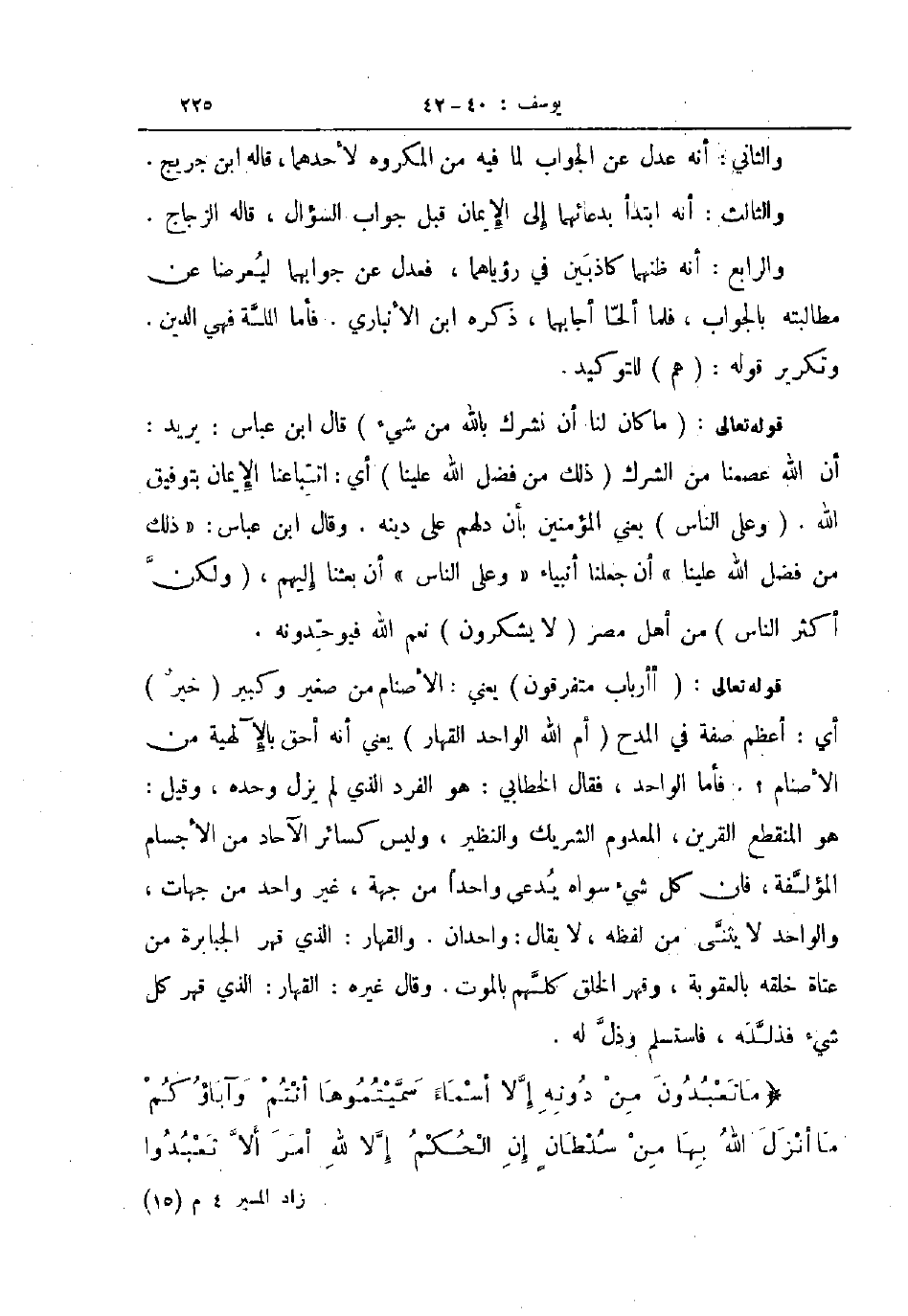 قوله تعالى ما كان لنا أن نشرك بالله من شيء قال ابن عباس يريد أن الله عصمنا من الشرك ذلك من فضل الله علينا أي اتباعنا الإيمان بتوفيق الله وعلى الناس يعني المؤمنين بأن دلهم على دينه وقال ابن عباس ذلك من فضل الله عينا أن جعلنا أنبياء وعلى الناس أن بعثنا إليهم ولكن أكثر الناس من أهل مصر لا يشكرون نعم الله فيوحدونه