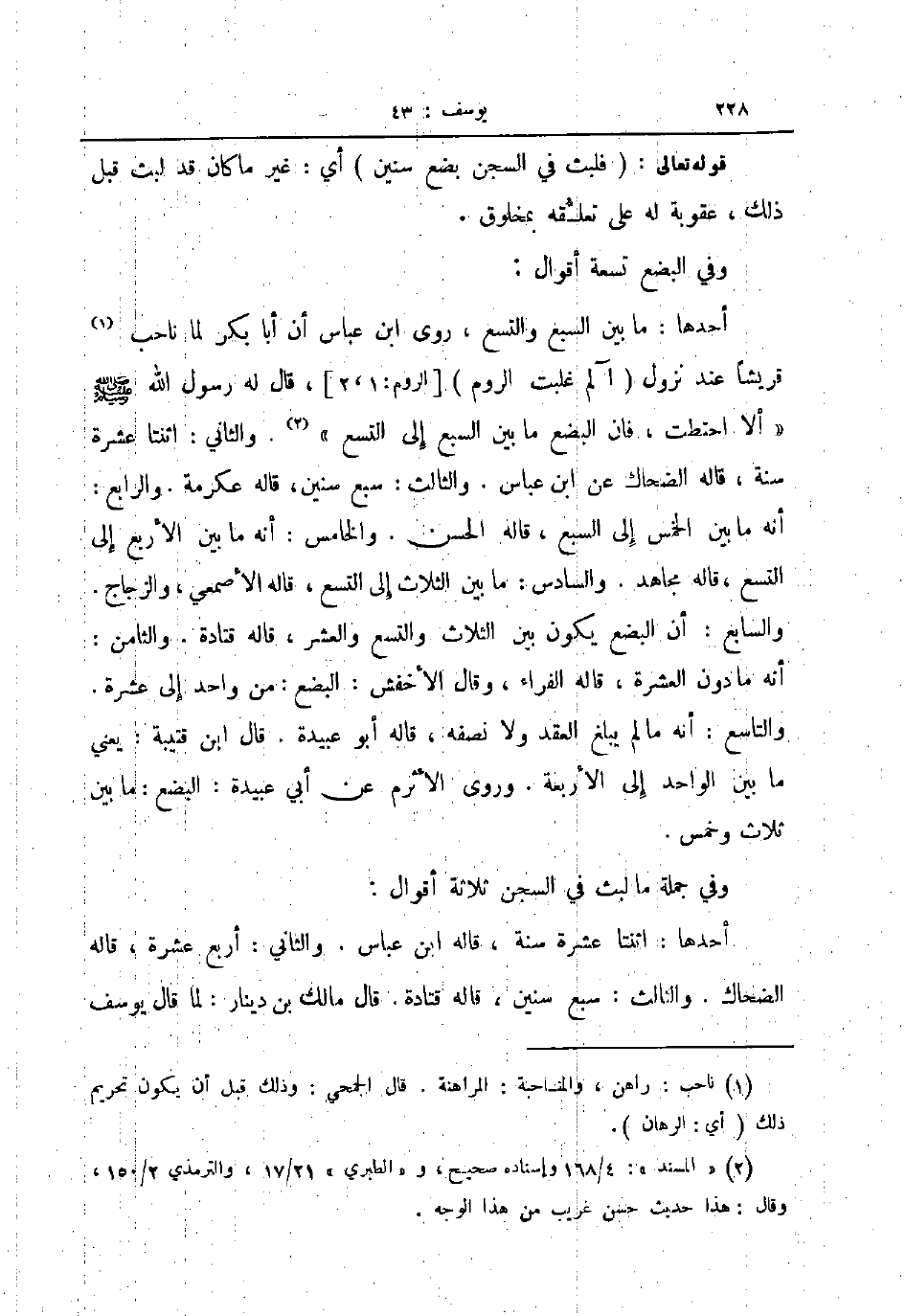 أحدها ما بين السبع والتسع روى ابن عباس أن أبا بكر لما ناحب قريشا عند نزول آلم غلبت الروم الروم 12 قال له رسول الله صلى الله عليه و سلم ألا احتطت فإن البضع ما بين السبع إلى التسع والثاني اثنتا عشرة سنة قاله الضحاك عن ابن عباس والثالث سبع سنين قاله عكرمة والرابع أنه ما بين الخمس إلى السبع قاله الحسن والخامس أنه ما بين الأربع إلى التسع قاله مجاهد والسادس ما بين الثلاث والتسع والعشر قاله قتادة والثامن أنه ما دون العشرة قاله الفراء وقال الأخفش البضع من واحد إلى عشرة والتاسع أنه مالم يبلغ العقد ولا نصفه قاله أبو عبيدة قال ابن قتيبة يعني ما بين الواحد إلى الأربعة وروى الأثرم عن أبي عبيدة البضع ما بين ثلاث وخمس