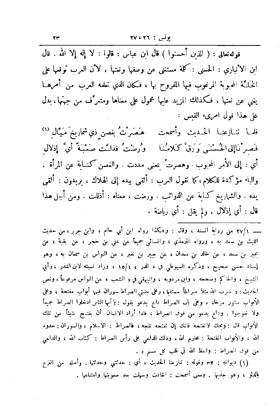 قوله تعالى للذين أحسنوا قال ابن عباس قالوا لا إله إلا الله قال ابن الأنباري الحسنى كلمة مستغنى عن وصفها ونعتها لأن العرب توقعها على الخلة المحبوبة المرغوب فيها المفروح بها فكان الذي تعلمه العرب من أمرها يغني عن نعتها فكذلك المزيد عليها محمول على معناها ومتعرف من جهتها يدل على هذا قول امرئ القيس ... فلما تنازعنا الحديث وأسمحت ... هصرت بغصن ذي شماريخ ميال ...