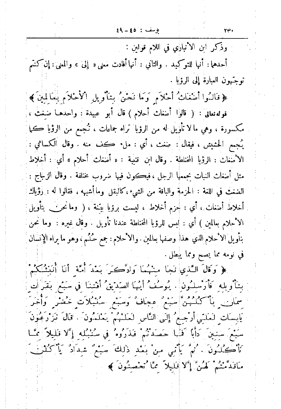 قوله تعالى قالوا أضغاث أحلام قال أبو عبيدة واحدها ضغث مكسورة وهي ما لا تأويل له من الرؤيا تراه جماعات تجمع من الرؤيا كما يجمع الحشيش فيقال ضغث أي ملء كف منه وقال الكسائي الأضغاث الرؤيا المختلطة وقال ابن قتيبة أضغاث أحلام أي أخلاط مثل أضغاث النبات يجمعها الرجل فيكون فيها ضروب مختلفة وقال الزجاج الضغث في اللغة الحزمة والباقة من الشيء كالبقل وما أشبهه فقالوا له رؤياك أخلاط أضغاث أي حزم أخلاط ليست برؤيا بينه وما نحن بتأويل الأحلام بعالمين أي ليس للرؤيا المخلتطة عندنا تأويل وقال غيره وما نحن بتأويل الأحلام الذي هذا وصفها بعالمين والأحلام جمع حلم وهو ما يراه الإنسان في نومه مما يصح ومما يبطل وقال الذي نجا منهما وادكر بعد أمة أنا أنبئكم بتأويله فأرسلون يوسف أيها الصديق أفتنا في سبع بقرات سمان يأكلهن سبع عجاف وسبع سنبلات خضر وأخر يابسات لعلي أرجع إلى الناس لعلهم يعلمون قال تزرعون سبع سنين دأبا فما حصدتم فذروه في سنبله إلى قليلا مما تأكلون ثم يأتي من بعد ذلك سبع شداد يأكلن ما قدمتم لهن إلا قليلا مما تحصنون