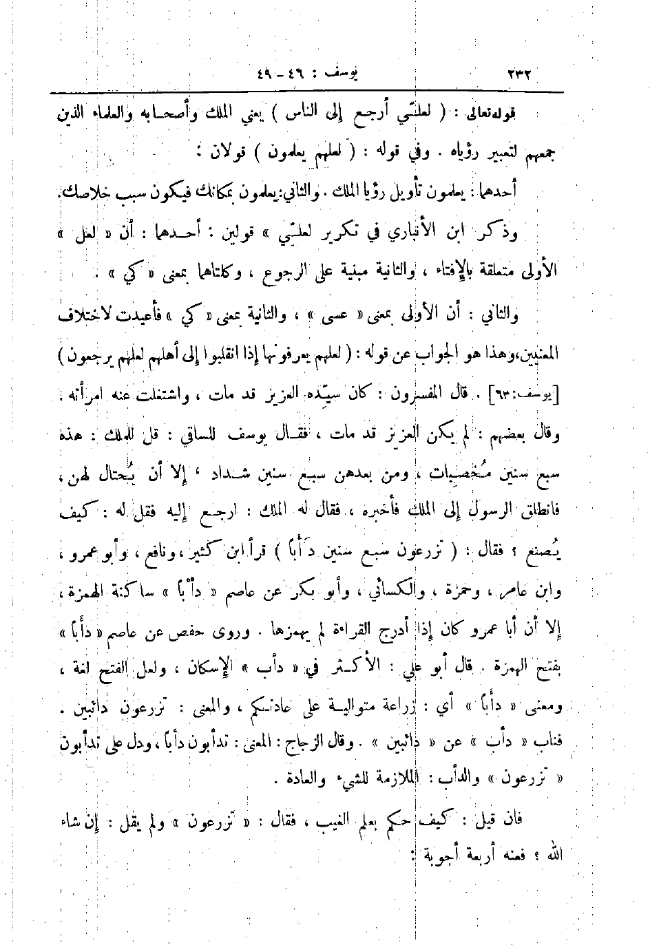 والثاني أن الأولى بمعنى عسى والثانية بمعنى كي فأعيدت لاختلاف المعنيين وهذا هو الجواب عن قوله لعلهم يعرفونها إذا انقلبوا إلى أهلهم لعلهم يرجعون يوسف 63 قال المفسرون كان سيده العزيز قد مات واشتغلت عنه امرأته وقال بعضهم لم يكن العزيز قد مات فقال يوسف للساقي قل للملك هذه سبع سنين مخصبات ومن بعدهن سبع سنين شداد إلا أن يحتال لهن فانطلق الرسول إلى الملك فأخبره فقال له الملك ارجع إليه فقل له كيف يصنع فقال تزرعون سبع سنين دأبا قرأ ابن كثير ونافع وأبو عمرو وابن عامر وحمزة والكسائي وأبو بكر عن عاصم دأبا ساكنه الهمزة إلا أن أبا عمرو كان إذا أدرج القراءة لم يهمزها وروى حفص عن عاصم دأبا بفتح الهمزة قال أبو علي الأكثر في دأب الإسكان ولعل الفتح لغة ومعنى دأبا أي زراعة متوالية على عادتكم والمعنى تزرعون دائبين فناب دأب عن دائبين وقال الزجاج المعنى تدأبون دأبا ودل على تدأبون تزرعون والدأب الملازمة للشيء والعادة