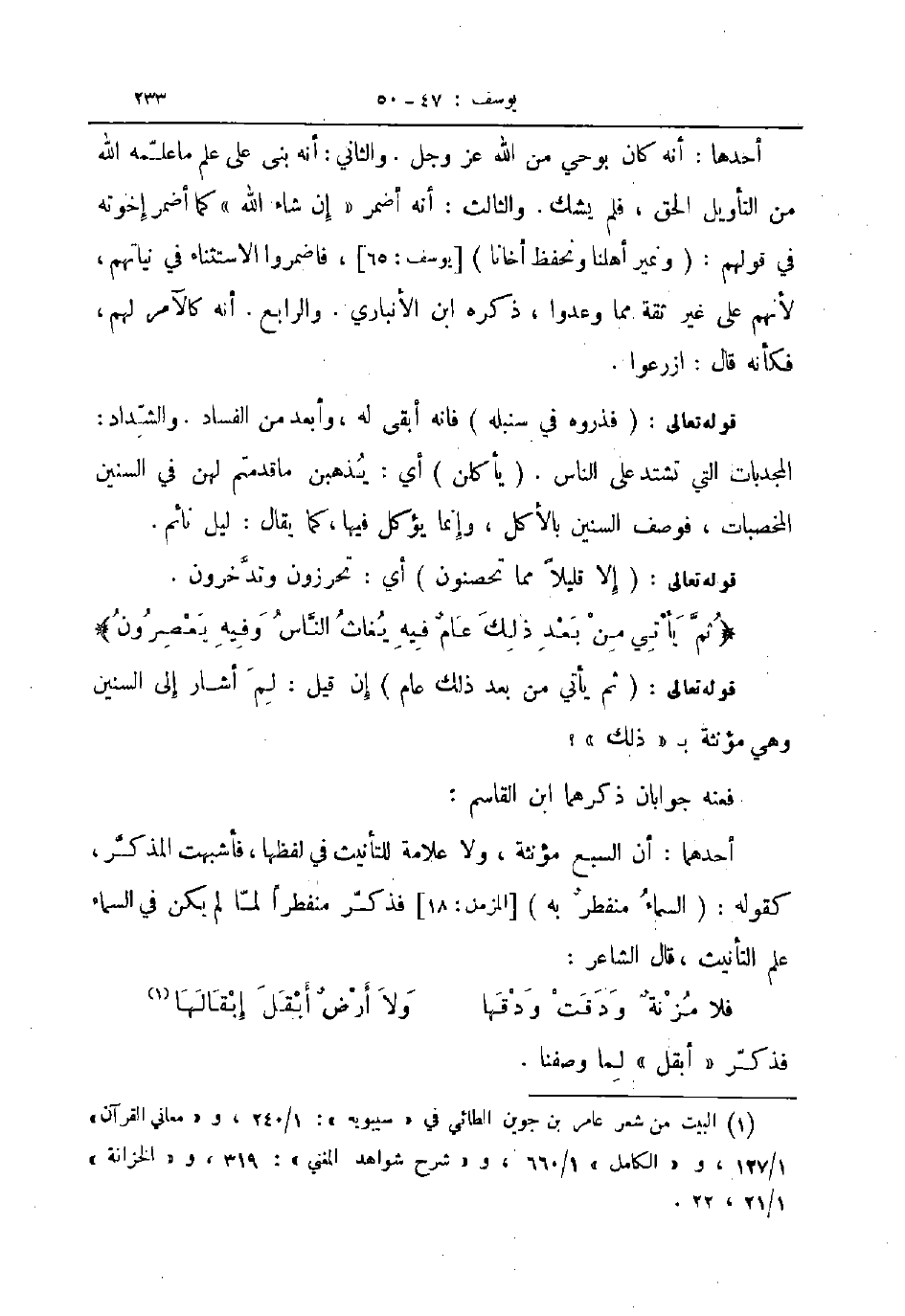 أحدهما أن السبع مؤنثه ولا علامة للتأنيث في لفظها فأشبهت المذكر كقوله السماء منفطر به المزمل 18 فذكر منفطرا لما لم يكن في السماء علم التأنيث قال الشاعر ... فلا مزنة ودقت ودقها ... ولا أرض أبقل إبقالها ...