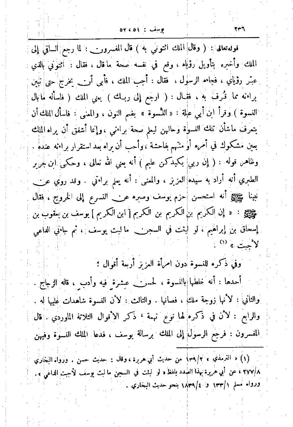 قوله تعالى وقال الملك ائتوني به قال المفسرون لما رجع الساقي إلى الملك وأخبره بتأويل رؤياه وقع في نفسه صحة ما قال فقال ائتوني بالذي عبر رؤياي فجاءه الرسول فقال أجب الملك فأبى أن يخرج حتى تبين براءته مما قرف به فقال ارجع إلى ربك يعني الملك فاسأله ما بال النسوة وقرأ ابن أبي عبلة النسوة بضم النون والمعنى فاسأل الملك أن يتعرف ما شأن تلك النسوة وحالهن ليعلم صحة براءتي وإنما أشفق أن يراه اللمك بعين مشكوك في أمره أو متهم بفاحشة وأحب أن يراه بعد استقرار براءته عنده وظاهر قوله إن ربي بكيدكن عليم أنه يعني الله تعالى وحكى ابن جرير الطبري أنه أراد به سيده العزيز والمعنى أنه يعلم براءتي وقد روي عن نبينا صلى الله عليه و سلم أنه استحسن حزم يوسف وصبره عن التسرع إلى الخروج فقال صلى الله عليه و سلم إن الكريم بن الكريم بن الكريم ابن الكريم يوسف بن يعقوب بن إسحاق بن إبراهيم لو لبثت في السجن ما لبث يوسف ثم جاءني الداعي لأجبت