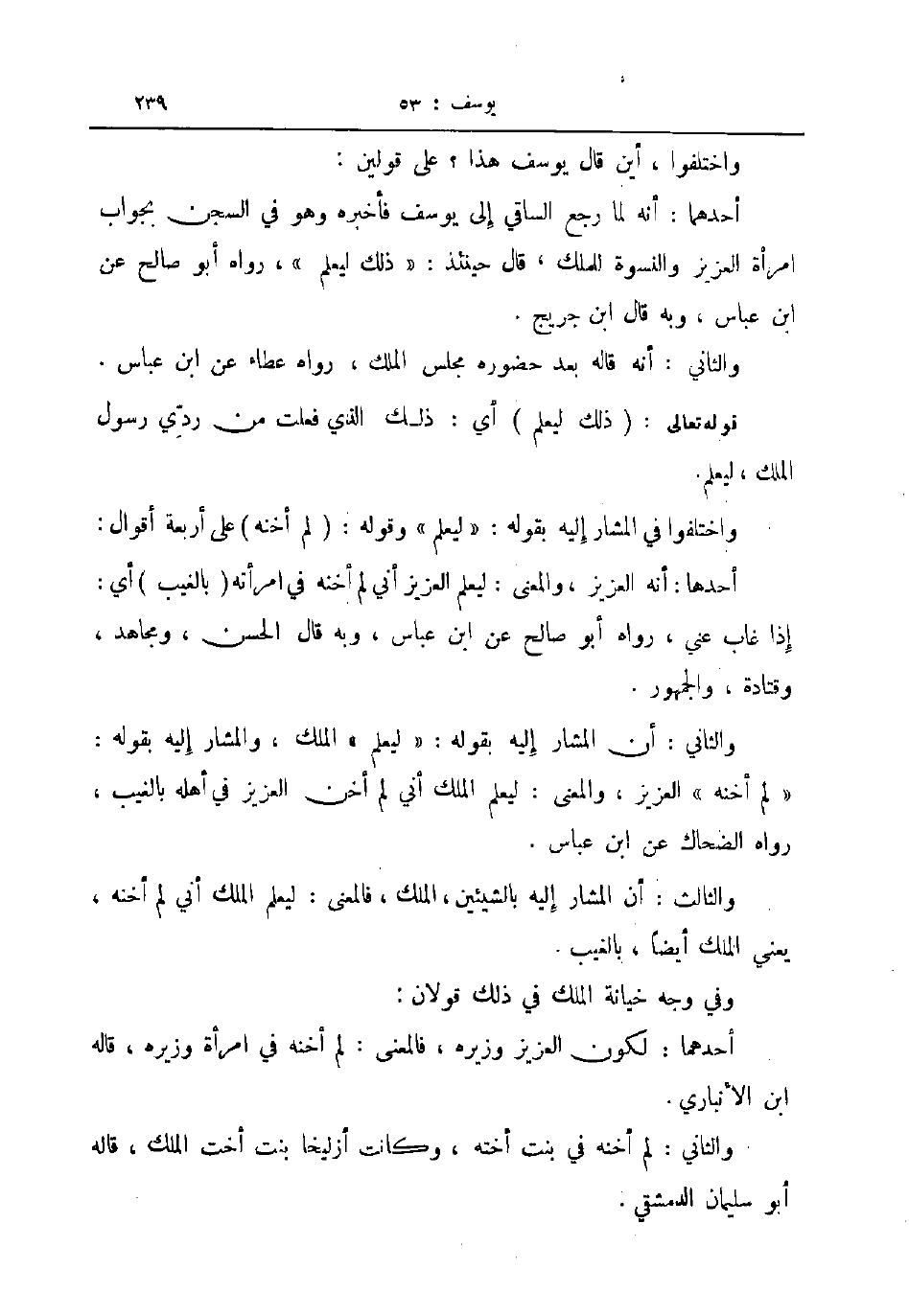 والثاني أن المشار إليه بقوله ليعلم الملك والمشار إليه بقوله لم أخنه العزيز والمعنى ليعلم الملك أني لم أخن العزيز في أهله بالغيب رواه الضحاك عن ابن عباس