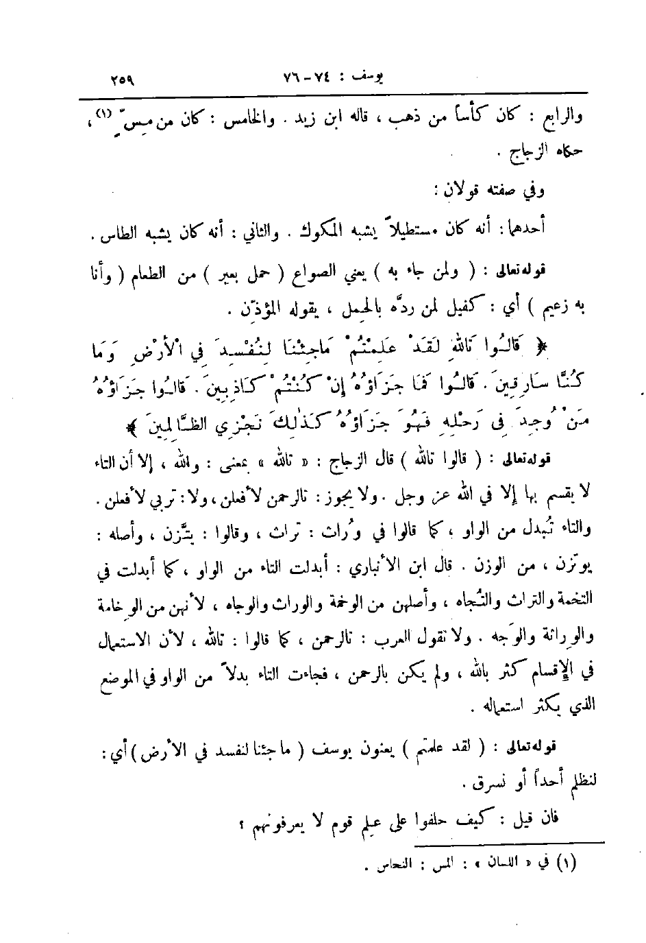 قوله تعالى قالوا تالله قال الزجاج تالله بمعنى والله إلا أن التاء لا يقسم بها إلى في الله عز و جل ولا يجوز تالرحمن لأفعلن ولا تربي لأفعلن والتاء تبدل من الوار كما قالوا في وراث تراث وقالوا يتزن وأصله يوتزن من الوزن قال ابن الأنباري أبدلت التاء من الواو كما أبدلت في التخمة والتراث والتجاه وأصلهن من الوخمة والوجاه لأنهن من الوخامة والوراثة والوجه ولا تقول العرب تالرحمن كما قالوا تالله لأن الاستعمال في الإقسام كثر بالله ولم يكن بالرحمن فجاءت التاء بدلا من الواو في الموضع الذي يكثر استعماله