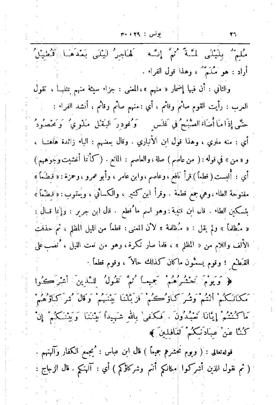 والثاني أن فيها إضمار منهم المعنى جزاء سيئة منهم بمثلها تقول العرب رأيت القوم صائم وقائم أي منهم صائم وقائم أنشد الفراء ... حتى إذا ما أضاء الصبح في غلس ... وغودر البقل ملوي ومحصود ... أي منه ملوي وهذا قول ابن الأنباري وقال بعضهم الباء زائدة هاهنا و من في قوله من عاصم صلة والعاصم المانع كأنما أغشيت وجوههم أي ألبست قطعا قرأ نافع وعاصم وابن عامر وأبو عمرو وحمزة قطعا مفتوحة الطاء وهي جمع قطعة وقرأ ابن كثير والكسائي ويعقوب قطعا بتسكين الطاء قال ابن قتيبة وهو اسم ما قطع قال ابن جرير وإنما قال مظلما ولم يقل مظلمة لأن المعنى قطعا من الليل المظلم ثم حذفت الألف واللام من المظلم فلما صار نكره وهو من نعت الليل نصب على القطع وقوم يسمون ما كان كذلك حالا وقوم قطعا ويوم نحشرهم جميعا ثم نقول للذين أشركوا مكانكم أنتم وشركاؤكم فزيلنا بينهم وقال شركاؤهم ما كنتم إيانا تعبدون فكفى بالله شهيدا بيننا وبينكم إن كنا عن عبادتكم لغافلين