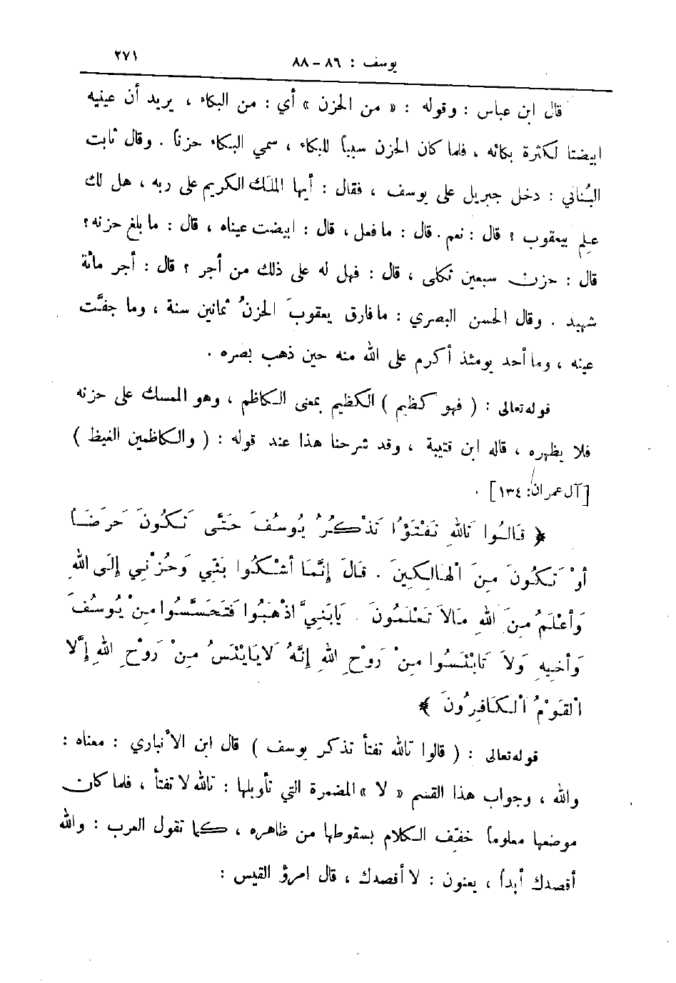 قوله تعالى قالوا تالله تفتأ تذكر يوسف قال ابن الأنباري معناه والله وجواب هذا القسم لا المضمرة التي تأويلها تالله لا تفتأ فلما كان موضعها معلوما خفف الكلام بسقوطها من ظاهره كما تقول العرب والله أقصدك أبدا يعنون لا أقصدك قال امرؤ القيس