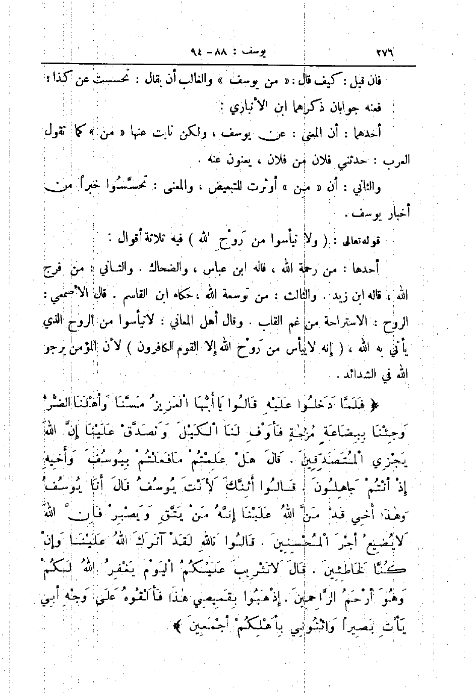 أحدها من رحمة الله قاله ابن عباس والضحاك والثاني من فرج الله قاله ابن زيد والثالث من توسعة الله حكاه ابن القاسم قال الأصمعي الروح الاستراحة من غم القلب وقال أهل المعاني لا تيأسوا من الروح الذي يأتي به الله إنه لاييأس من روح الله إلا القوم الكافرون لأن المؤمن يرجوا الله في الشدائد فلما دخلوا عليه قالوا يا أيها العزيز مسنا وأهلنا الضر وجئنا ببضاعةمزجة فأوف لنا الكيل وتصدق علينا إن الله يجزي المتصدقين قال هل علمتم ما فعلتم بيوسف وأخيه إذ أنتم جاهلون قالوا أئنك لأنت يوسف قال أنا يوسف وهذا أخي قد من الله علينا إنه من يتق ويصبر فإن الله لا يضيع أجر المحسنين قالوا تالله لقد آثرك الله علينا وإن كنا لخاطئين قال لا تثريب عليكم اليوم يغفر الله لكم وهو أرحم الراحمين إذهبوا بقميصي هذا فألقوه على وجه أبي يأت بصيرا وائتوني بأهلكم أجمعين