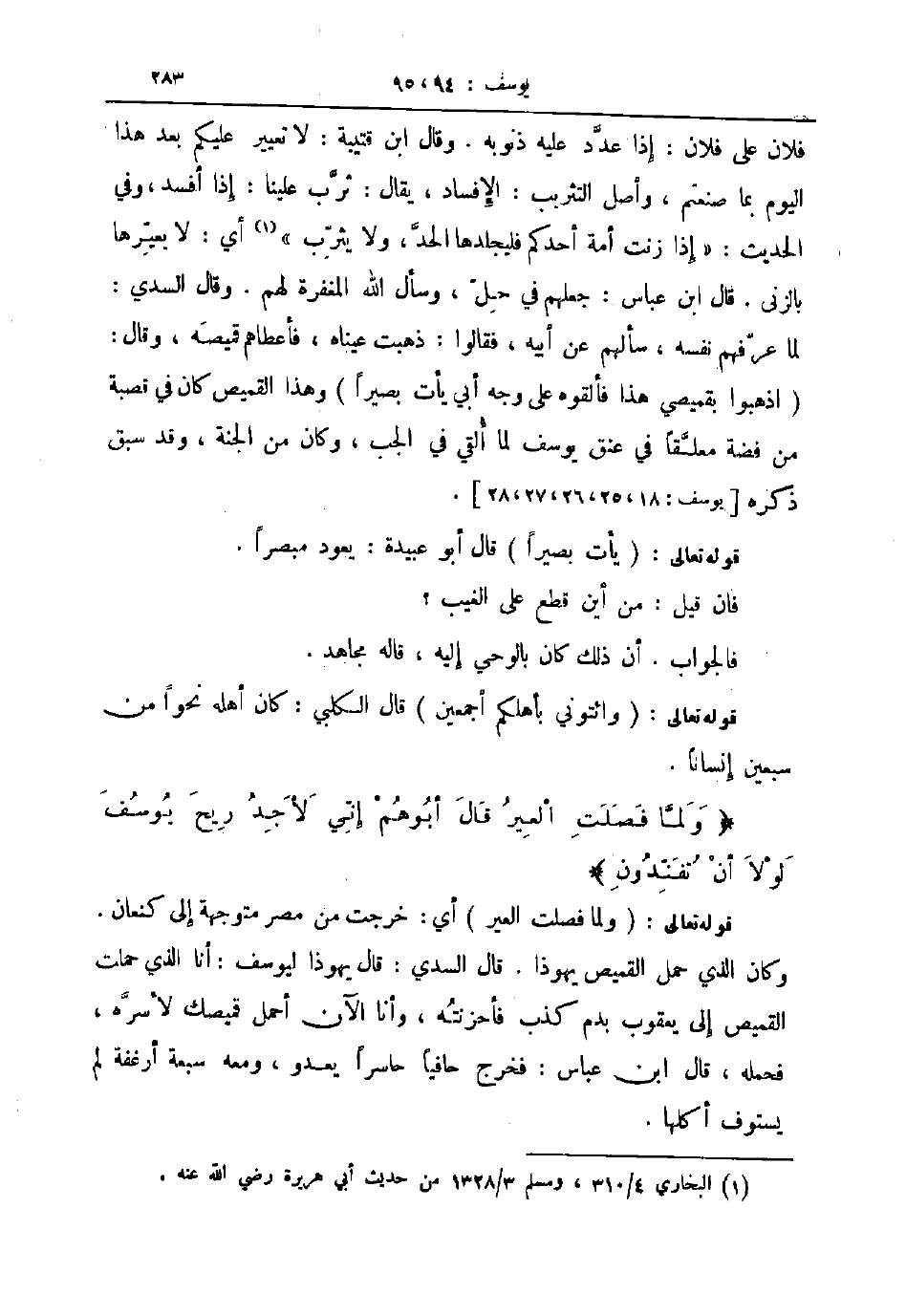 فلان على فلان إذا عدد عليه ذنوبه وقال ابن قتيبة لا تعيير عليكم بعد هذا اليوم بما صنعتم وأصل التثريب الإفساد يقال ثرب علينا إذا أفسد وفي الحديث إذا زنت أمة أحدكم فليجلدها الحد ولا يثرب أي لا يعيرها بالزنى قال ابن عباس جعلهم في حل وسأل الله المغفرة لهم وقال السدي لما عرفهم نفسه سألهم عن أبيه فقالوا ذهبت عيناه فأعطاهم قميصه وقال اذهبوا بقميصي هذا فألقوه على وجه أبي يأت بصيرا وهذا القميص كان في قصبة من فضة معلقا في عنق يوسف لما ألقي في الجب وكان من الجنة وقد سبق ذكره يوسف 1825 26 27 28