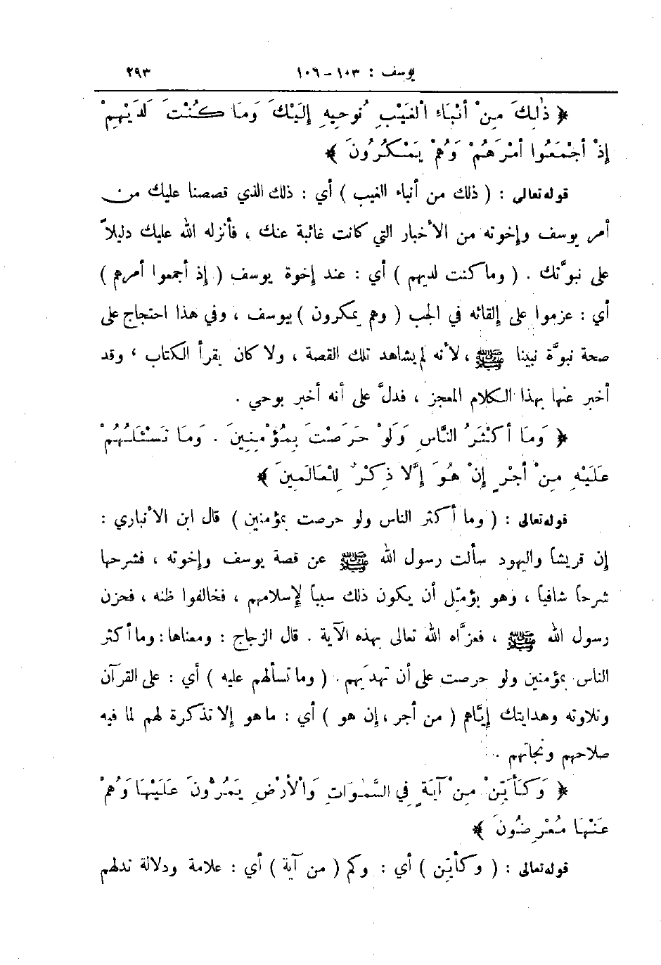 قوله تعالى وما أكثر الناس ولو حرصت بمؤمنين قال ابن الأنباري إن قريشا واليهود سألت رسول الله صلى الله عليه و سلم عن قصة يوسف وإخوته فشرحها شرحا شافيا وهو يؤمل ان يكون ذلك سبا لإسلامهم فخالفوا ظنه فحزن رسول الله صلى الله عليه و سلم فعزاه الله تعالى بهذه الآية قال الزجاج ومعناها وما أكثر الناس بمؤمنين ولو حرصت على أن تهديهم وما تسألهم عليه أي على القرآن وتلاوته وهدايتك إياهم من أجر إن هو أي ما هو إلا تذكرة لهم لما فيه صلاحهم ونجاتهم وكأين من آية في السموات والأرض يمرون عليها وهم عنها معرضون