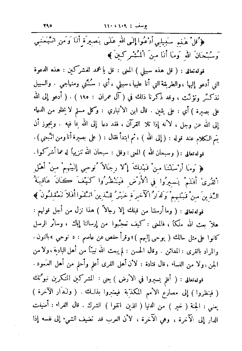 قوله تعالى قل هذه سبيلي المعنى قل يا محمد للمشركين هذه الدعوة التي أدعو إليها والطريقة التي أنا عليها سبيلي أي سنتي ومنهاجي والسبيل تذكر وتؤنث وقد ذكرنا ذلك في آل عمران 195 أدعوا إلى الله على بصيرة أي على يقين قال ابن الأنباري وكل مسلم لا يخلو من الدعاء إلى الله عز و جل لأنه إذا تلا القرآن فقد دعا إلى الله بما فيه ويجوز أن يتم الكلام عند قوله إلى الله ثم ابتدأ فقال على بصيرة أنا ومن اتبعني