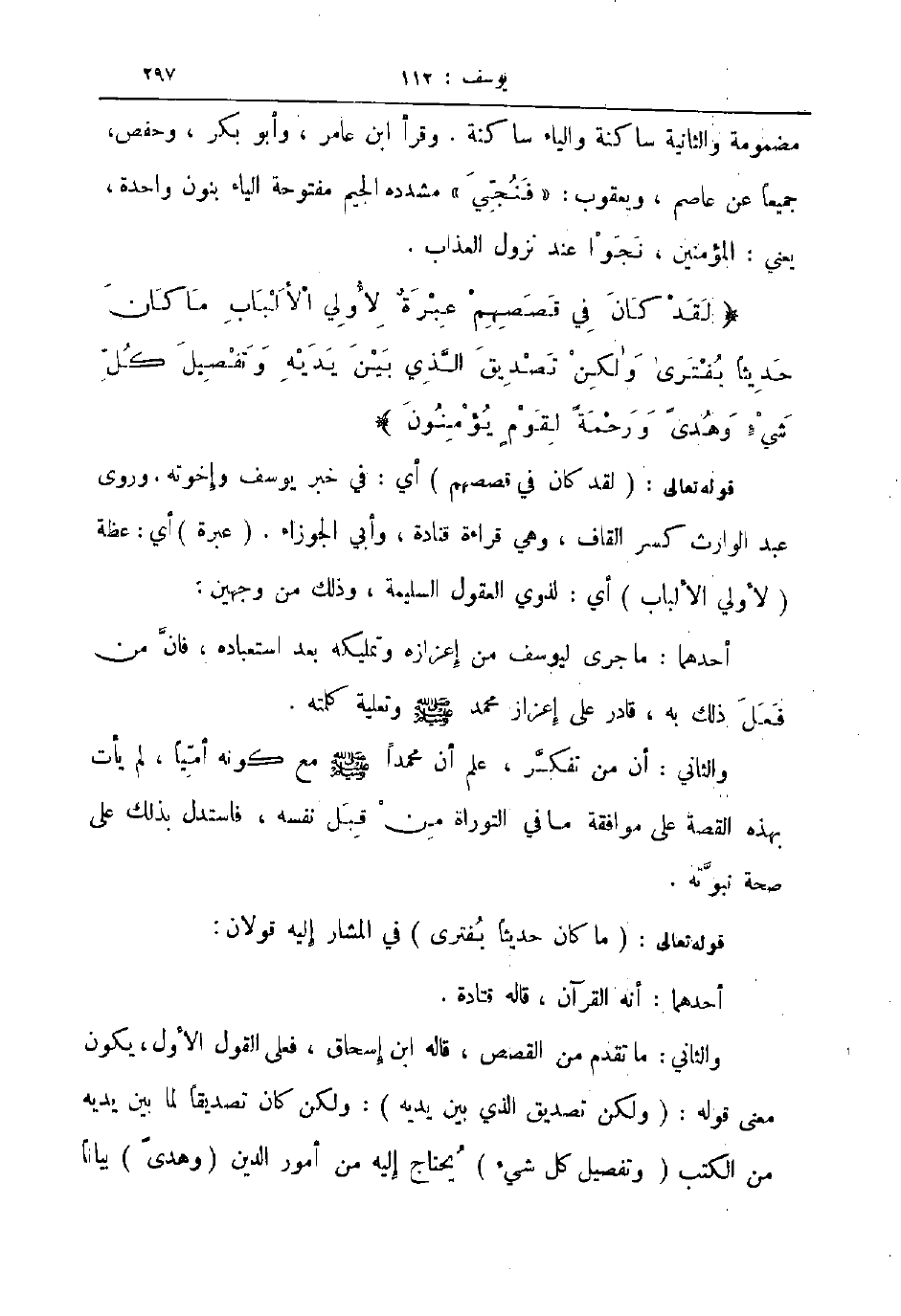 مضمومة والثانية ساكنة والياء ساكنة وقرأ ابن عامر وأبو بكر وحفص جميعا عن عاصم ويعقوب فنجي مشدده الجيم مفتوحة الياء بنون واحدة يعني المؤمنين نجوا عند نزول العذاب لقد كان في قصصهم عبرة لأولي الألباب ما كان حديثا يفترى ولكن تصديق الذي بين يديه وتفصيل كل شيء وهدى ورحمة لقوم يؤمنون