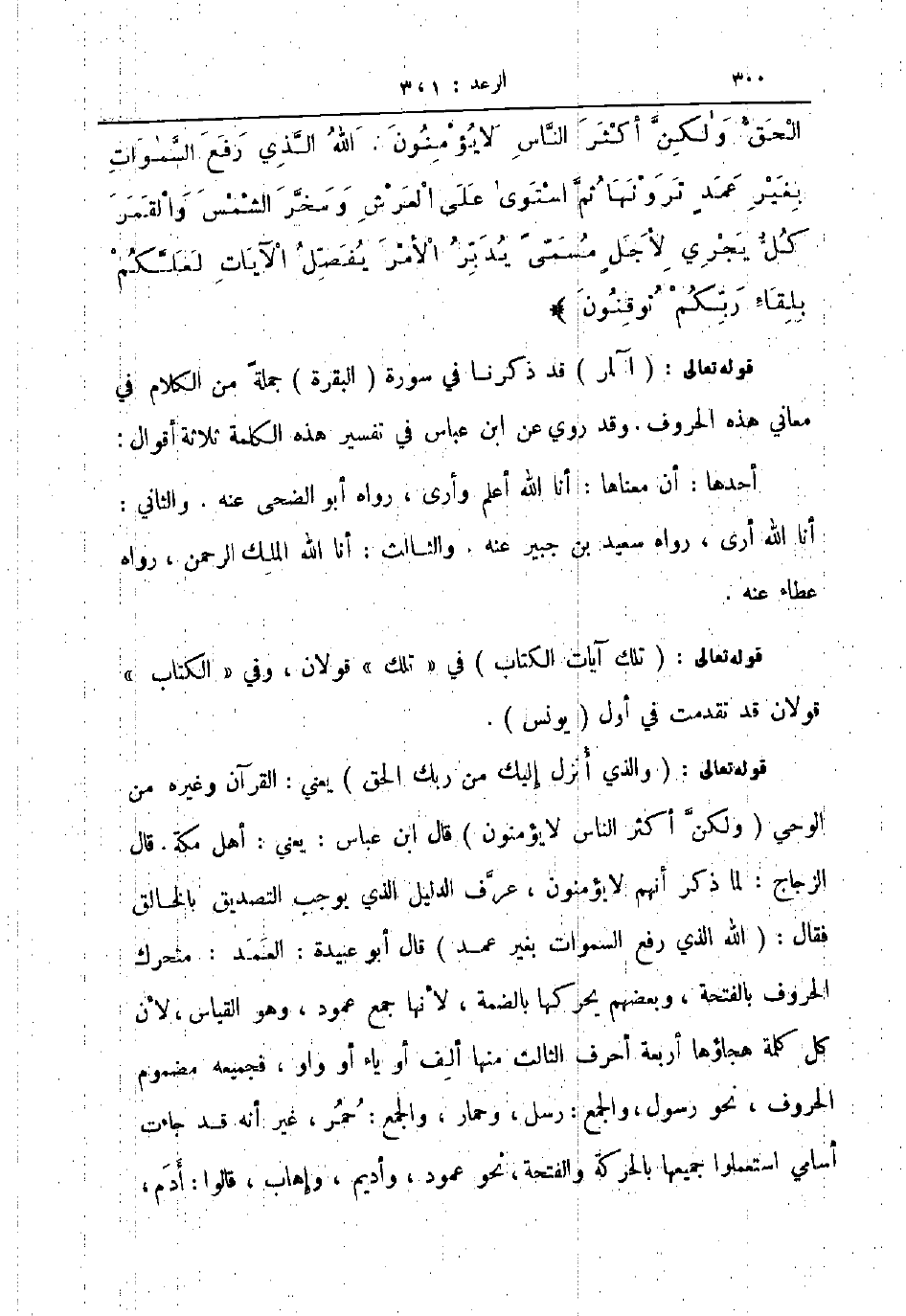 قوله تعالى و الذي أنزل إليك من ربك الحق يعني القرآن وغيره من الوحي ولكن أكثر الناس لا يؤمنون قال ابن عباس يعني أهل مكة قال الزجاج لما ذكر أنهم لا يؤمنون عرف الدليل الذي يوجب التصديق بالخالق فقال الله الذي رفع السموات بغير عمد قال أبو عبيدة العمد متحرك الحروف بالفتحة وبعضهم يحركها بالضمة لأنها جمع عمود وهو القياس لأن كل كلمة هجاؤها أربعة أحرف الثالث منها ألف أو ياء أو واو فجميعه مضموم الحروف نحو رسول والجمع رسل وحمار والجمع حمر غير أنه قد جاءت أسامي استعملوا جميعها بالحركة والفتحة نحو عمود وأديم وإهاب قالوا ادم