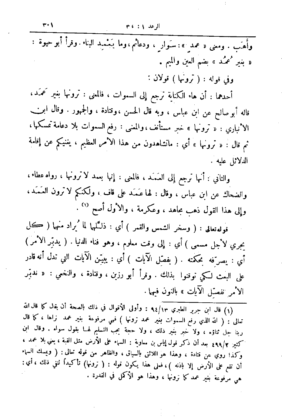 والثاني أنها ترجع إلى العمد فالمعنى إنها بعمد لا ترونها رواه عطاء والضحاك عن ابن عباس وقال لها عمد على قاف ولكنكم لا ترون العمد وإلى هذا القول ذهب مجاهد وعكرمة والأول أصح