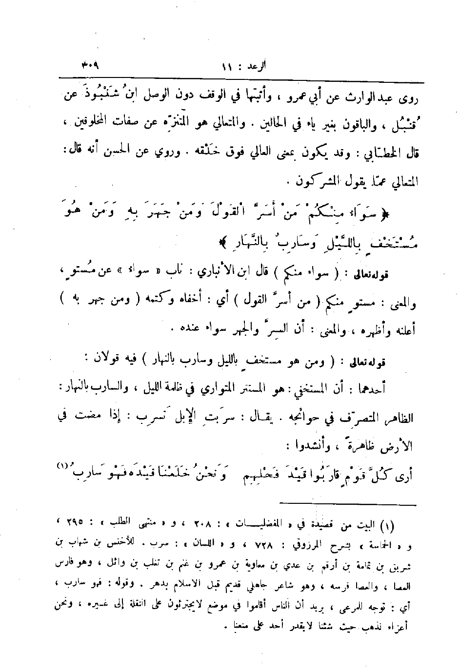 أحدهما أن المستخفي هو المستتر المتواري في ظلمة الليل والسارب بالنهار الظاهر المتصرف في حوائجة يقال سربت الإبل تسرب إذا مضت في الأرض ظاهرة وأنشدوا ... أرى كل قوم قاربوا قيد فحلهم ... ونحن خلعنا قيده فهو سارب