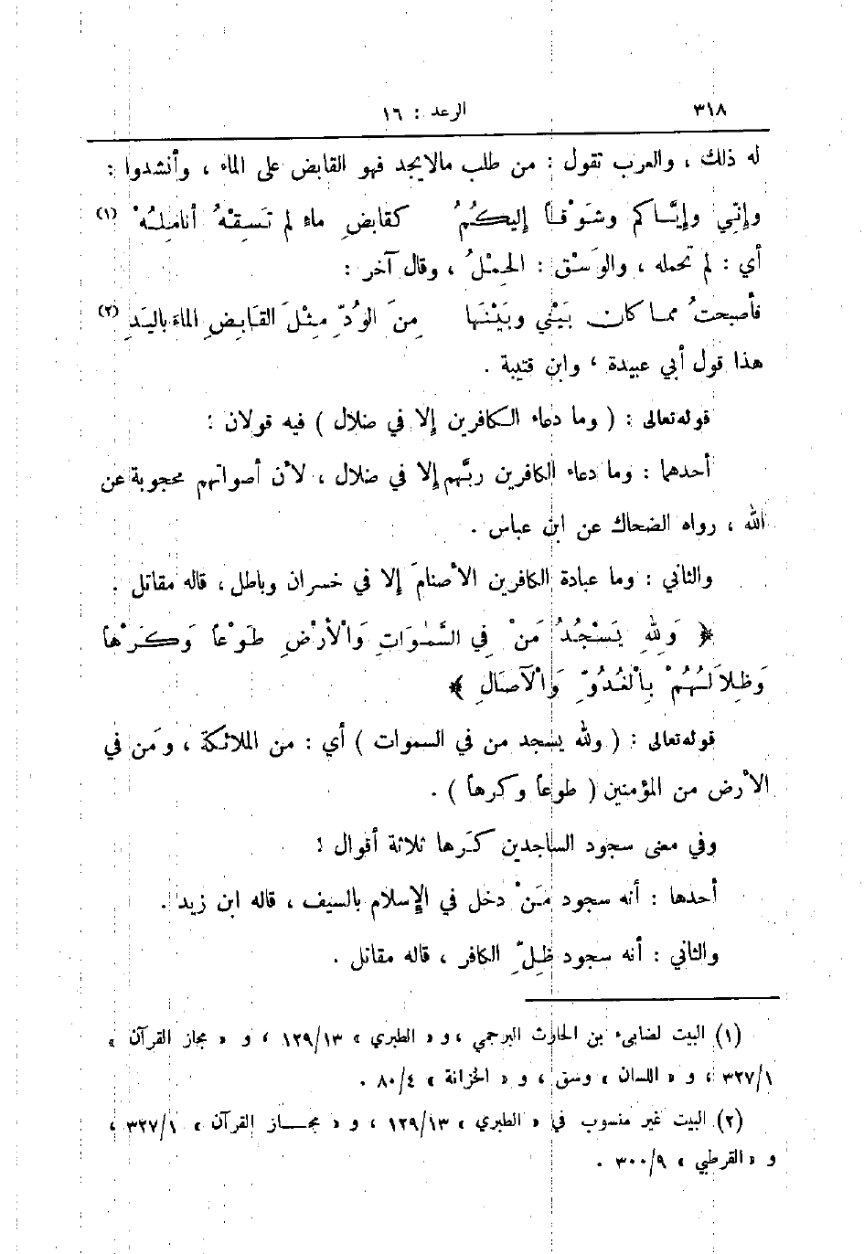 والثاني وما عبادة الكافرين الأصنام إلا في خسران وباطل قاله مقاتل ولله يسجد من في السموات والأرض طوعا وكرها وظلالهم بالغدو والآصال