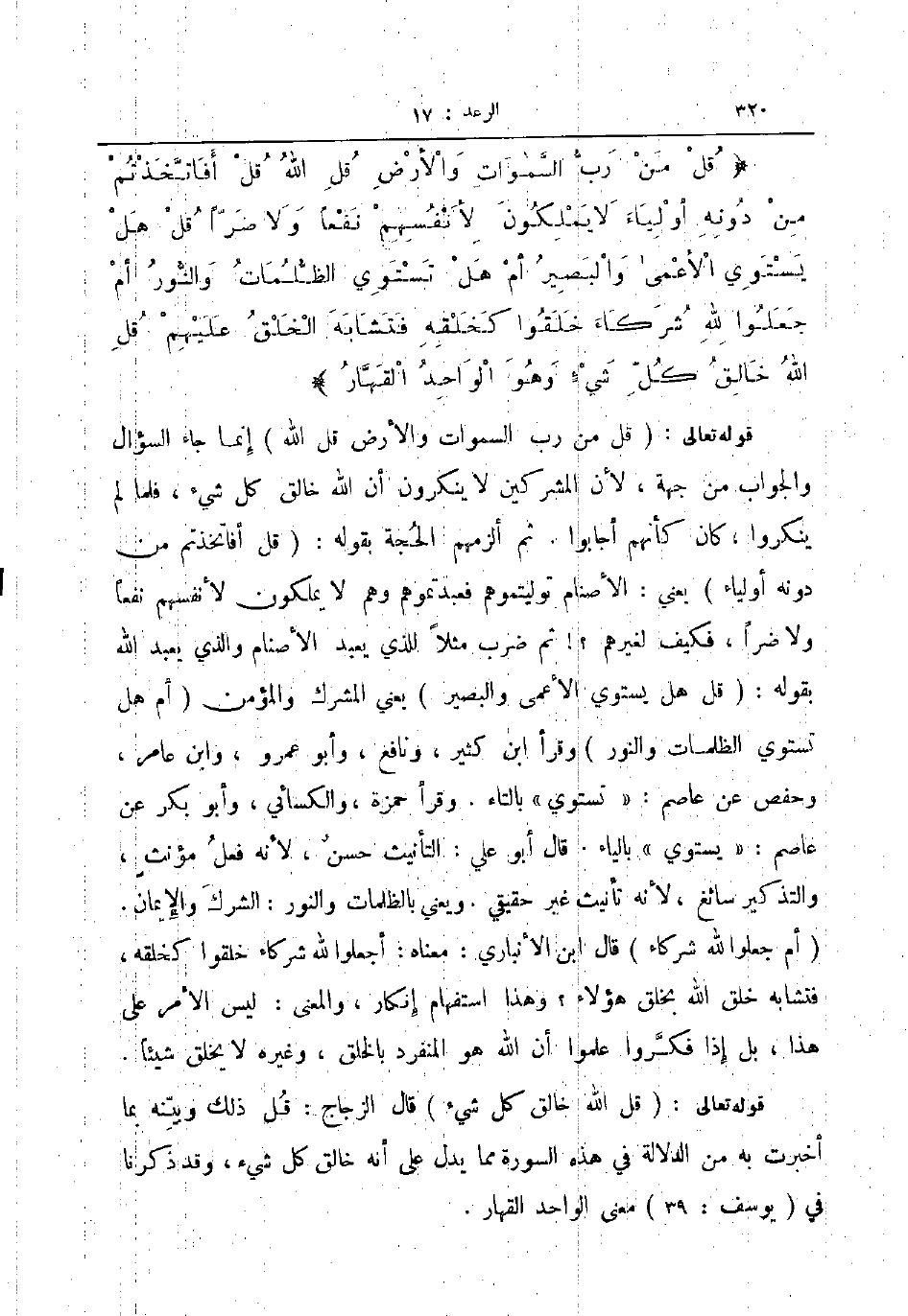 قل من رب السموات والأرض قل الله قل أفاتخذتم من دونه أولياء لا يملكون لأنفسهم نفعا ولا ضرا قل هل يستوي الأعمى والبصير أم هل تستوي الظلمات والنور أم جعلوا لله شركاء خلقوا كخلقه فتشابه الخلق عليهم قل الله خالق كل شيء وهو الواحد القهار