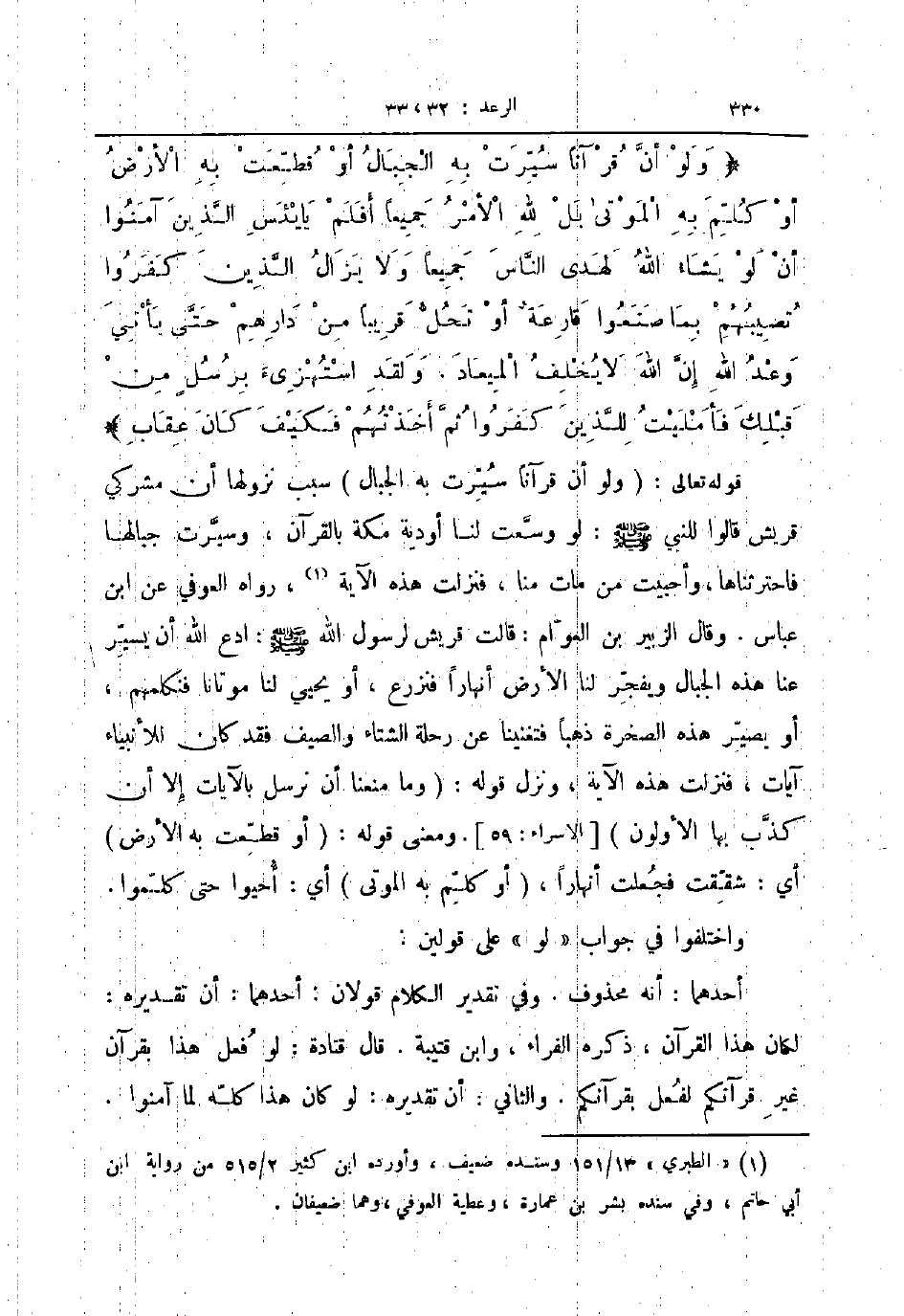 قوله تعالى ولو أن قرآنا سيرت به الجبال سبب نزولها أن مشركي قريش قالوا للنبي صلى الله عليه و سلم لو وسعت لنا أودية مكة بالقرآن وسرت جبالها فاحترثناها وأحييت من مات منا فنزلت هذه الآية رواه العوفي عن ابن عباس وقال الزبير بن العوام قالت قريش لرسول الله صلى الله عليه و سلم ادع الله أن يسير عنا هذه الجبال ويفجر لنا الأرض أنهارا فنزرع أو يحيى لنا موتانا فنكلمهم أو يصير هذه الصخرة ذهبا فتغنينا عن رحلة الشتاء والصيف فقد كان للأنبياء آيات فنزلت هذه الآية ونزل قوله ومامنعنا أن نرسل بالآيات إلا أن كذب بها الأولون الاسراء 59 ومعنى قوله أو قطعت به الأرض أي شققت فجعلت أنهارا أو كلم به الموتى أي أحيوا حتى كلموا