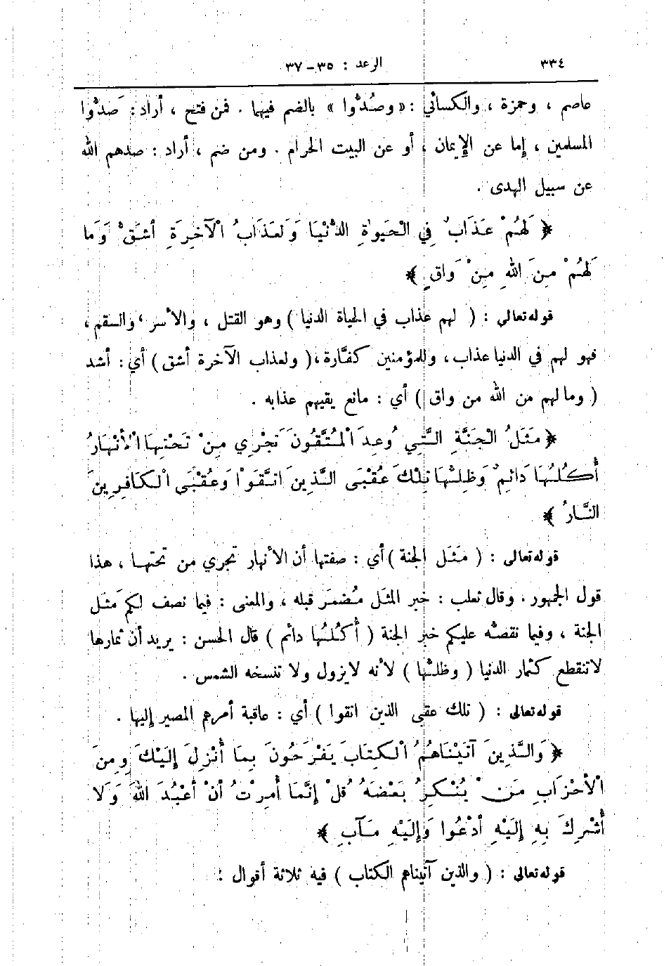 قوله تعالى لهم عذاب في الحياة الدنيا وهو القتل والأسر والسقم فهو لهم في الدنيا عذاب وللمؤمنين كفارة ولعذاب الآخرة أشق أي أشد وما لهم من الله من واق أي مانع يقيهم عذابه مثل الجنة التي وعد المتقون تجري من تحتها الأنهار أكلها دائم وظلها تلك عقبى الذين اتقوا وعقبى الكافرين النار
