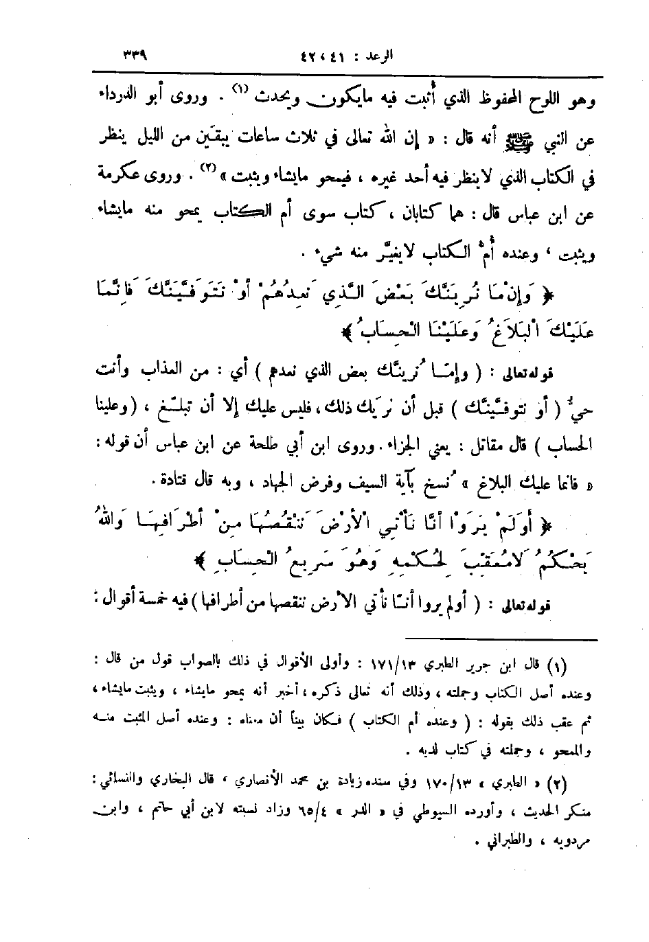 قوله تعالى وإما نرينك بعض الذي نعدهم أي من العذاب وأنت حي أو نتوفينك قبل أن نريك ذلك فليس عليك إلا أن تبلغ وعلينا الحساب قال مقاتل يعني الجزاء وروى ابن أبي طلحة عن ابن عباس أن قوله فإنما عليك البلاغ نسخ بآية السيف وفرض الجهاد وبه قال قتادة أولم يروا أنا نأتي الأرض ننقصها من أطرافها والله يحكم لا معقب لحكمه وهو سريع الحساب