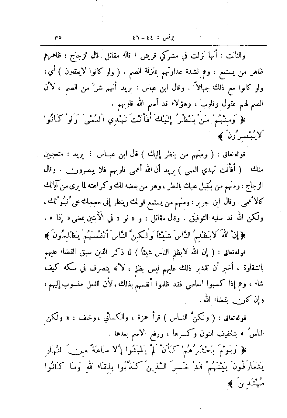 قوله تعالى ولكن الناس قرأ حمزة والكسائي وخلف ولكن الناس بتخفيف النون وكسرها ورفع الإسم بعدها ويوم يحشرهم كأن لم يلبثوا إلا ساعة من النهار يتعارفون بينهم قد خسر الذين كذبوا بلقاء الله وما كانوا مهتدين