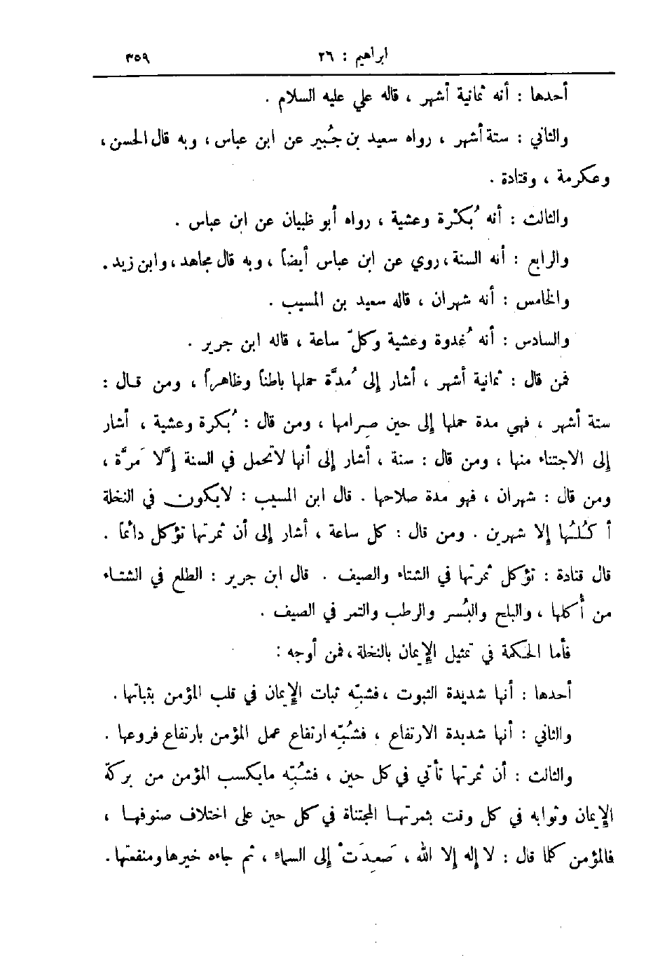 فمن قال ثمانية أشهر أشار إلى مدة حملها باطنا وظاهرا ومن قال ستة أشهر فهي مدة حملها إلى حين صرامها ومن قال بكرة وعشية أشار إلى الأجتناء منها ومن قال سنة أشار إلى أنها لاتحمل في السنة إلا مرة ومن قال شهران فهو مدة صلاحها قال ابن المسيب لا يكون في النخلة أكلها إلا شهرين ومن قال كل ساعة أشار إلى أن ثمرتها تؤكل دائما قال قتادة تؤكل ثمرتها في الشتاء والصيف قال ابن جرير الطلع في الشتاء من أكلها والبلح والبسر والرطب والتمر في الصيف