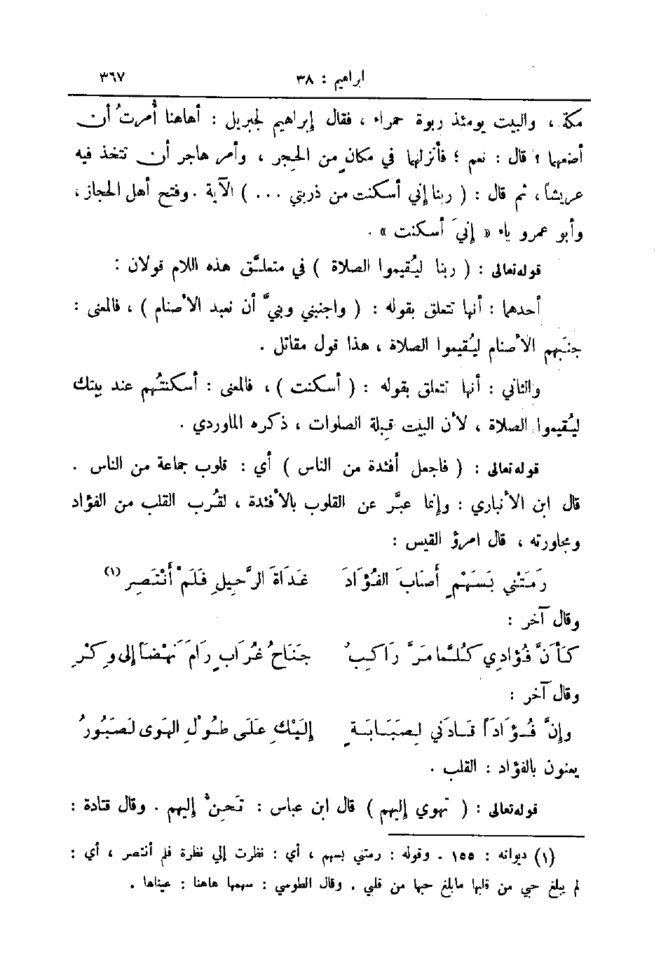 قوله تعالى فاجعل أفئدة من الناس أي قلوب جماعة من الناس قال ابن الأنباري وإنما عبر عن القلوب بالأفئدة لقرب القلب من الفؤاد ومجاورته قال امرؤ القيس ... رمتني بسهم أصاب الفؤاد ... غداة الرحيل فلم أنتصر ...
