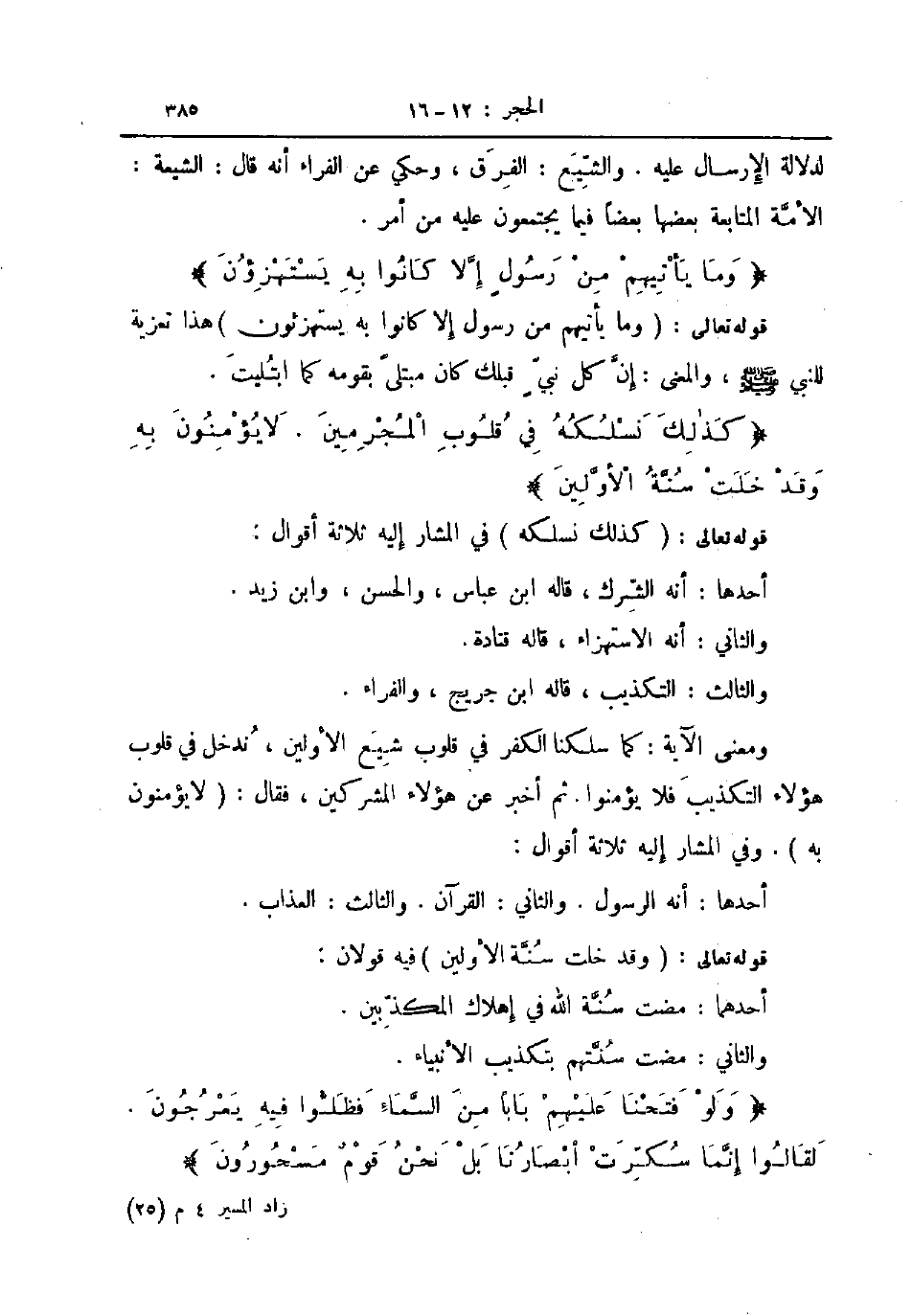 ومعنى الآية كما سلكنا في قلوب شيع الأولين ندخل في قلوب هؤلاء التكذيب فلا يؤمنوا ثم أخبر عن هؤلاء المشركين فقال لايؤمنون به وفي المشار إليه ثلاثة أقوال