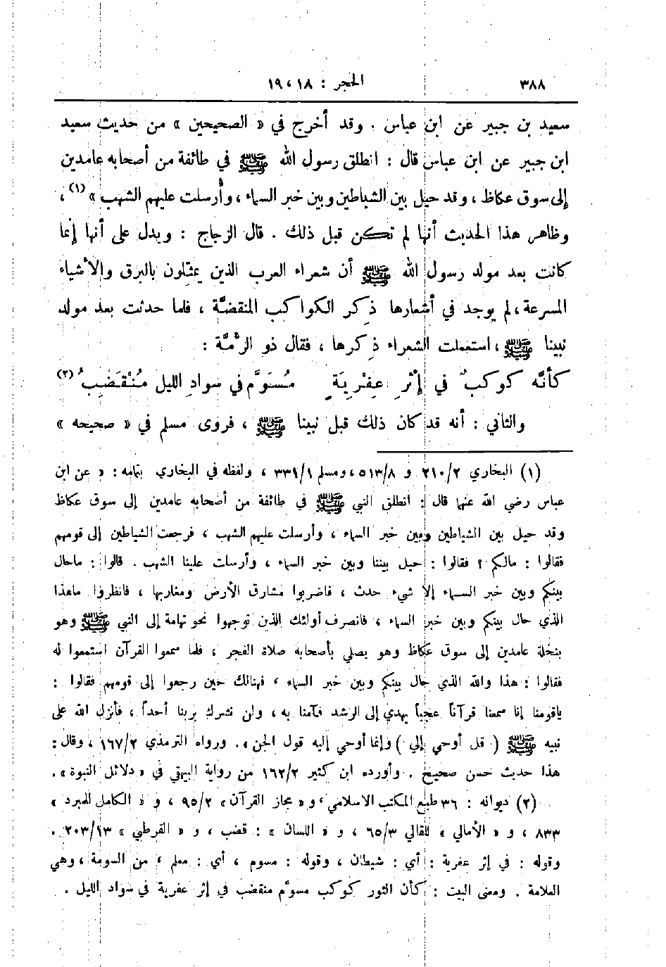سعيد بن جبير عن ابن عباس وقد أخرج في الصحيحين من حديث سعيد ابن جبير عن ابن عباس قال انطلق رسول الله ص - في طائفة من أصحابه عامدين إلى سوق عكاظ وقد حيل بين الشياطين وبين خبر السماء وأرسلت عليهم الشهب وظاهر هذا الحديث أنها لم تكن قبل ذلك قال الزجاج ويدل على أنها إنما كانت بعد مولد رسول الله ص - أن شعراء العرب الذين يمثلون بالبرق والأشياء المسرعة لم يوجد في أشعارها ذكر الكواكب المنقضة فلما حدثت بعد مولد نبينا ص - استعملت الشعراء ذكرها فقال ذو الرمة ... كذا كوكب في إثر عفرية ... مسوم في سواد الليل منقضب ...