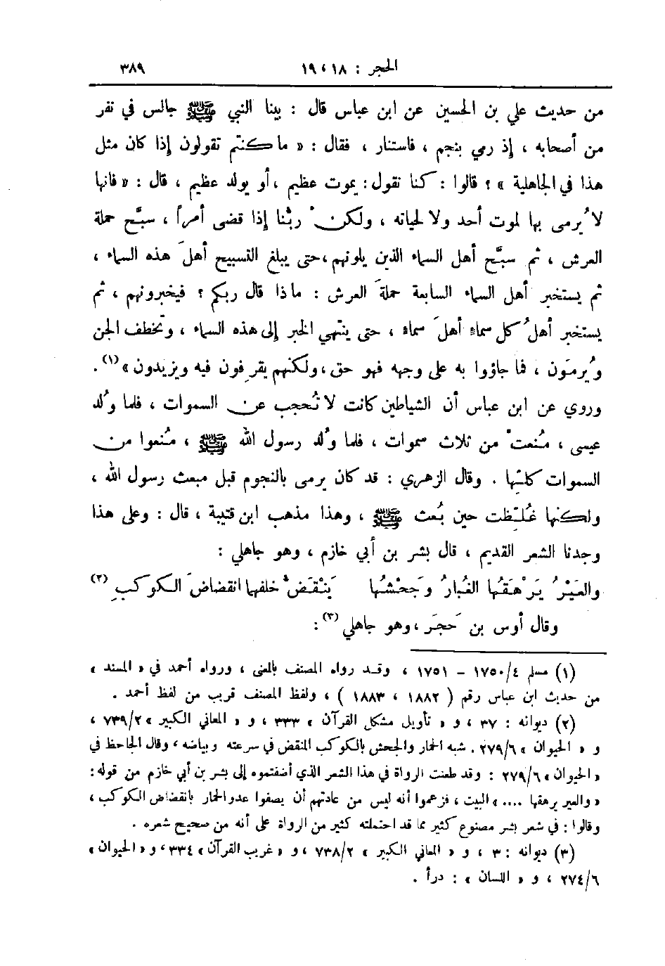 من حديث علي بن الحسين عن ابن عباس قال بينما النبي ص - جالس في نفر من أصحابه إذ رمي بنجم فاستنار فقال ما كنتم تقولون إذا كان مثل هذا في الجاهلية قالوا كنا نقول يموت عظيم أو يولد عظيم قال فإنها لا يرمى بها لموت أحد ولا لحياته ولكن ربنا إذا قضى أمرا سبح حملة العرش ثم سبح أهل السماء الذين يلونهم حتى يبلغ التسبيح أهل هذه السماء ثم يستخبر أهل السماء السابعة حملة العرش ماذا قال ربكم فيخبرونهم ثم يستخبر أهل كل سماء أهل سماء حتى ينتهي الخبر إلى هذه السماء وتخطف الجن ويرمون فما جاؤوا به على وجهه فهو حق ولكنهم يقرفون فيه ويزيدون وروي عن ابن عباس أن الشاطين كانت لا تحجب عن السموات فلما ولد عيسى منعت من ثلاث سموات فلما ولد رسول الله ص - منعوا من السموات كلها وقال الزهري قد كان يرمى بالنجوم قبل مبعث رسول الله ولكنها غلظت حين بعث ص - وهذا مذهب ابن قتيبة قال وعلى هذا وجدنا الشعر القديم قال بشر بن أبي خازم وهو جاهلي ... والعير يرهقها الغبار وجحشها ... ينقض خلفهما انقضاض الكوكب ...