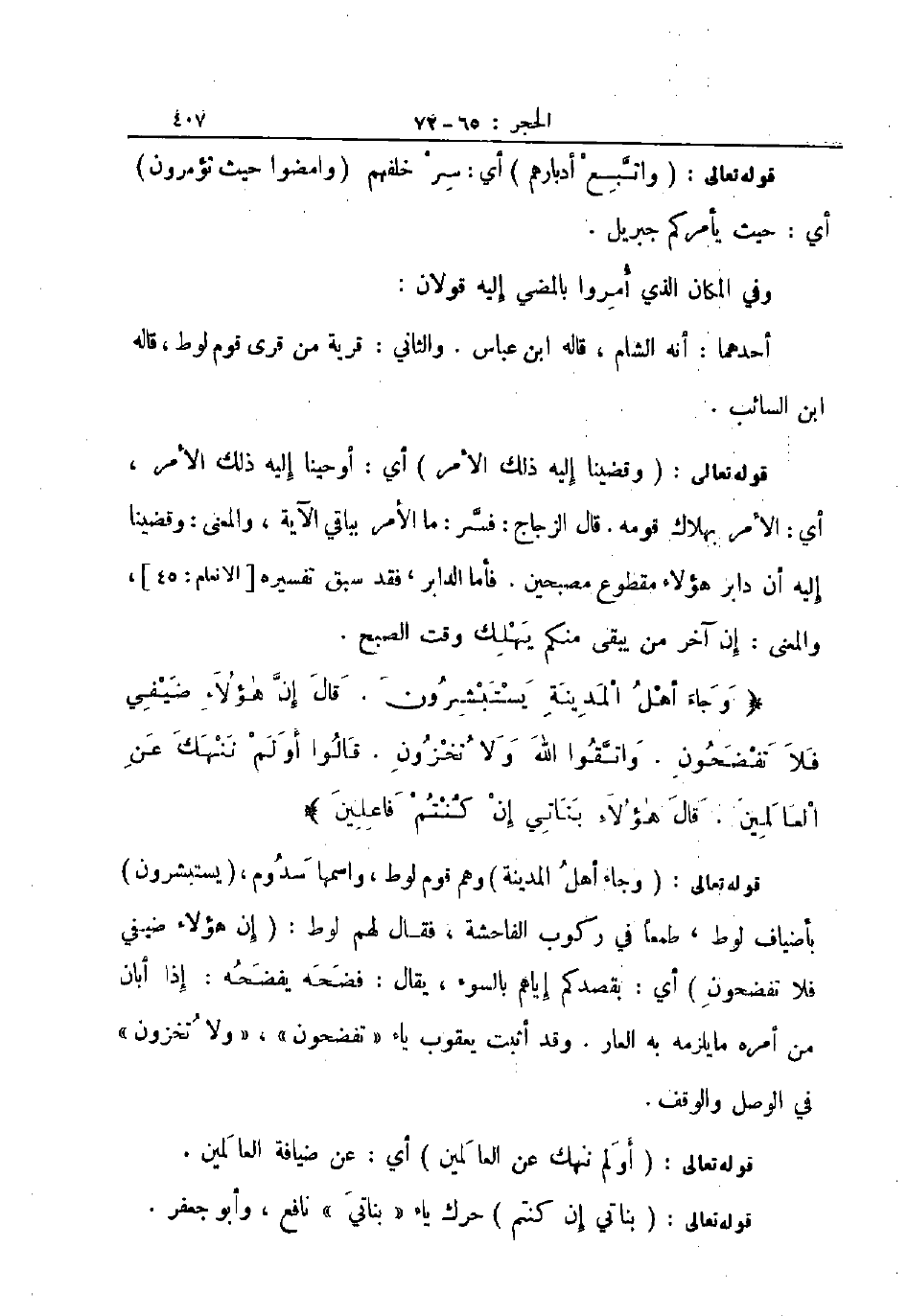 قوله تعالى وقضينا إليه ذلك الأمر أي أوحينا إليه ذلك الأمر أي الأمر بهلاك قومه قال الزجاج فسر ما الأمر بباقي الآية والمعنى وقضينا إليه أن دابر هؤلاء مقطوع مصبحين فأما الدابر فقد سبق تفسره الأنعام 45 والمعنى إن آخر من يبقى منكم يهلك وقت الصبح وجاء أهل المدينة يستبشرون قال إن هؤلاء ضيفي فلا تفضحون واتقوا الله ولا تخزون قالوا أولم ننهك عن العالمين قال هؤلاء بناتي إن كنتم فاعلين