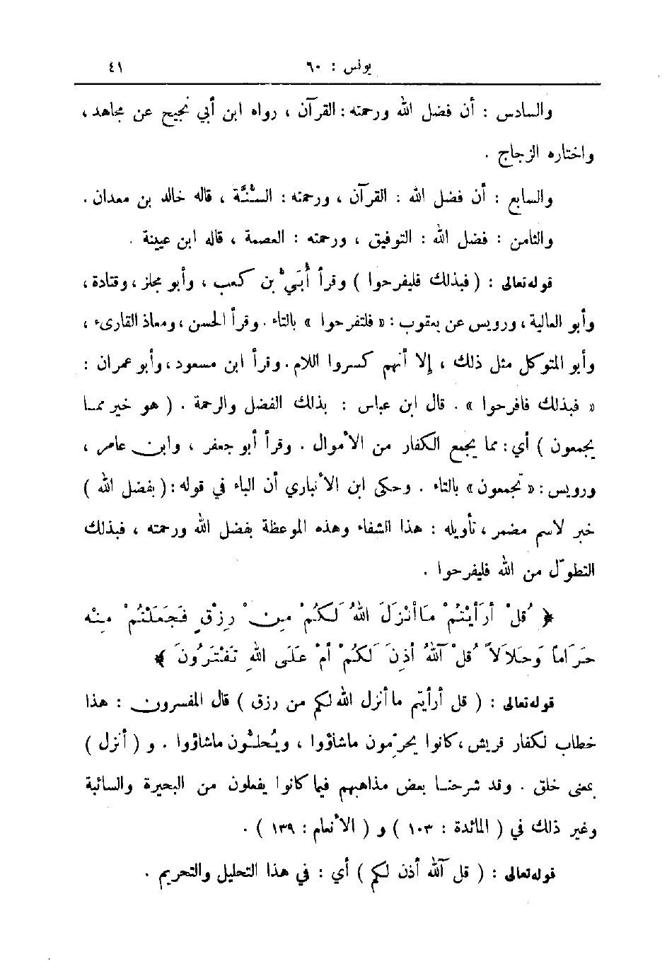 والسادس أن فضل الله ورحمته القرآن رواه ابن أبي نجيح عن مجاهد واختاره الزجاج