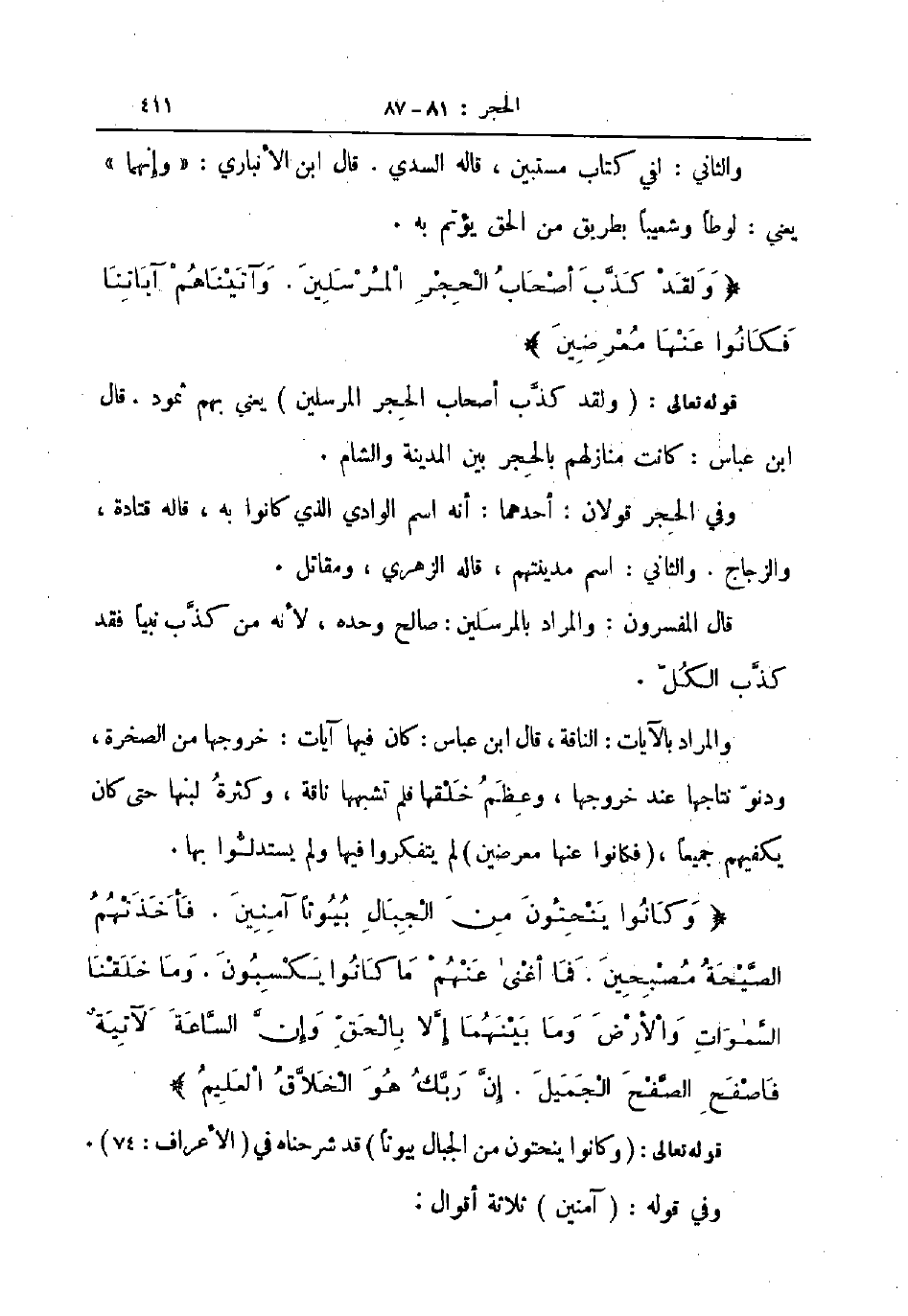 والمراد بالآيات الناقة قال ابن عباس كان في آيات خروجها من الصخرة ودنو نتاجها عند خروجها وعظم خلقها فلم تشبهها ناقة وكثرة لبنها حتى كان يكفيهم جميعا فكانوا عنها معرضين لم يتفكروا فيها ولم يستدلوا بها وكانوا ينحتون من الجبال بيوتا آمنين فأخذتهم الصيحة مصبحين فما أغنى عنهم ما كانوا يكسبون وما خلقنا السموات والأرض وما بينهما إلا الحق وإن الساعة لآتية فاصفح الصفح الجميل إن ربك هو الخلاق العليم