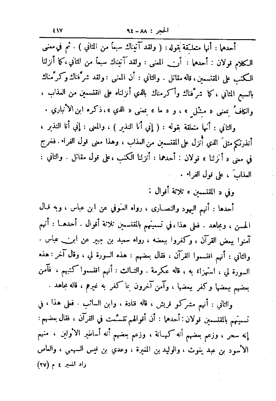أحدها أنهم اليهود والنصارى رواه العوفي عن ابن عباس وبه قال الحسن ومجاهد فعلى هذا في تسميتهم بالمقتسمين ثلاثة أقوال أحدها أنهم آمنواببعض القرآن وكفروا ببعضه رواه سعيد بن جبير عن ابن عباس والثاني أنهم اقتسموا القرآن فقال بعضهم هذه السورة لي وقال آخر هذه السورة لي استهزاء به قاله عكرمة والثالث أنهم اقتسموا كتبهم فآمن بعضهم ببعضها وكفر ببعضها وآمن آخرون بما كفر به غيرهم قاله مجاهد