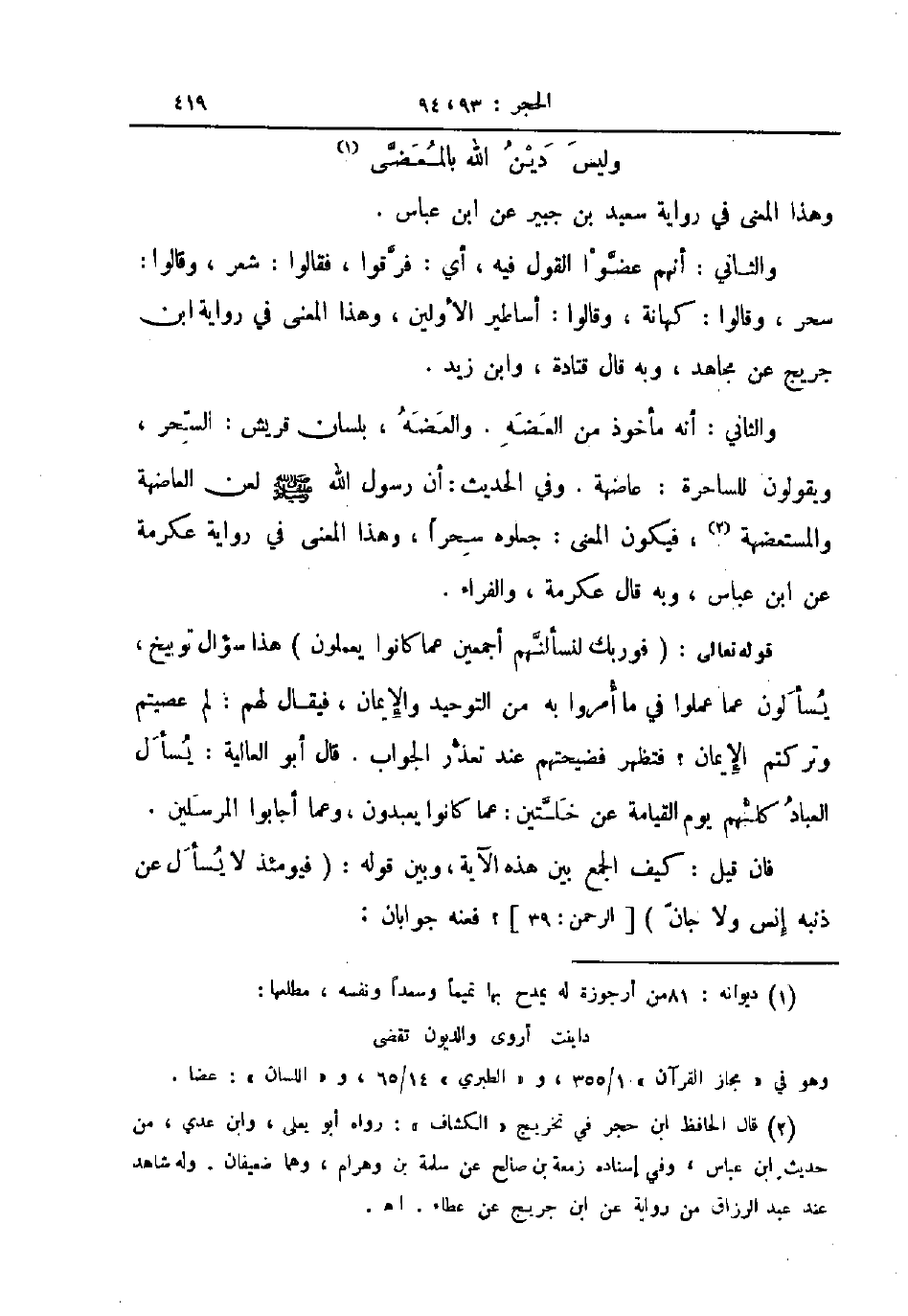 قوله تعالى فوربك لنسألنهم أجميعن عما كانوا يعملون هذا سؤال توبيخ يسألون عما عملوا في ما أمروا به من التوحيد والإيمان فيقال لهم لم عصيتهم وتركتم الإيمان فتظهر فضيحتهم عند تعذر الجواب قال أبو العالية يسأل العباد كلهم يوم القيامة عن خلتين عما كانوا يعبدون وعما أجابوا المرسلين