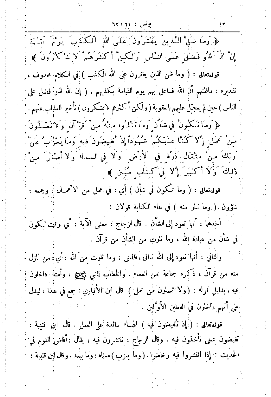 قوله تعالى وما ظن الذين يفترون على الله الكذب في الكلام محذوف تقديره ما ظنهم أن الله فاعل بهم يوم القيامة بكذبهم إن الله لذو فضل على الناس حين لم يعجل عليهم بالعقوبة ولكن أكثرهم لا يشكرون تأخير العذاب عنهم وما تكون في شأن وما تتلوا منه من قرآن ولا تعملون من عمل إلا كنا عليكم شهودا إذ تفيضون فيه وما يعزب عن ربك من مثقال ذرة في الأرض ولا في السماء ولا أصغر من ذلك ولا أكبر إلا في كتاب مبين
