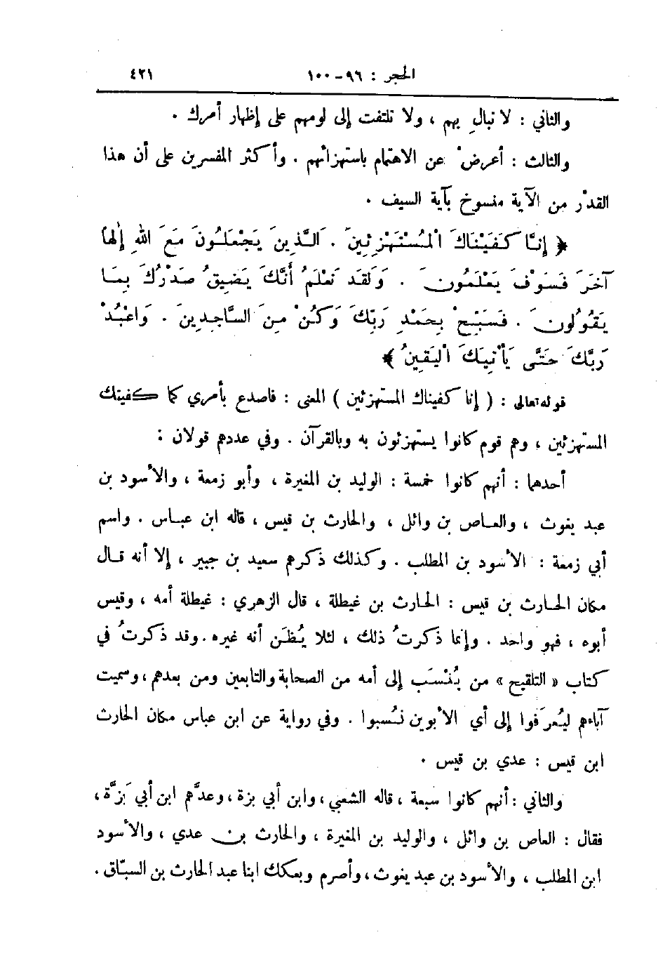 قوله تعالى إنا كفيناك المستهزئين المعنى فاصدع بأمري كما كفيتك المستهزئن وهم قوم كانوا يستهزئون به وبالقرآن وفي عددهم قولان
