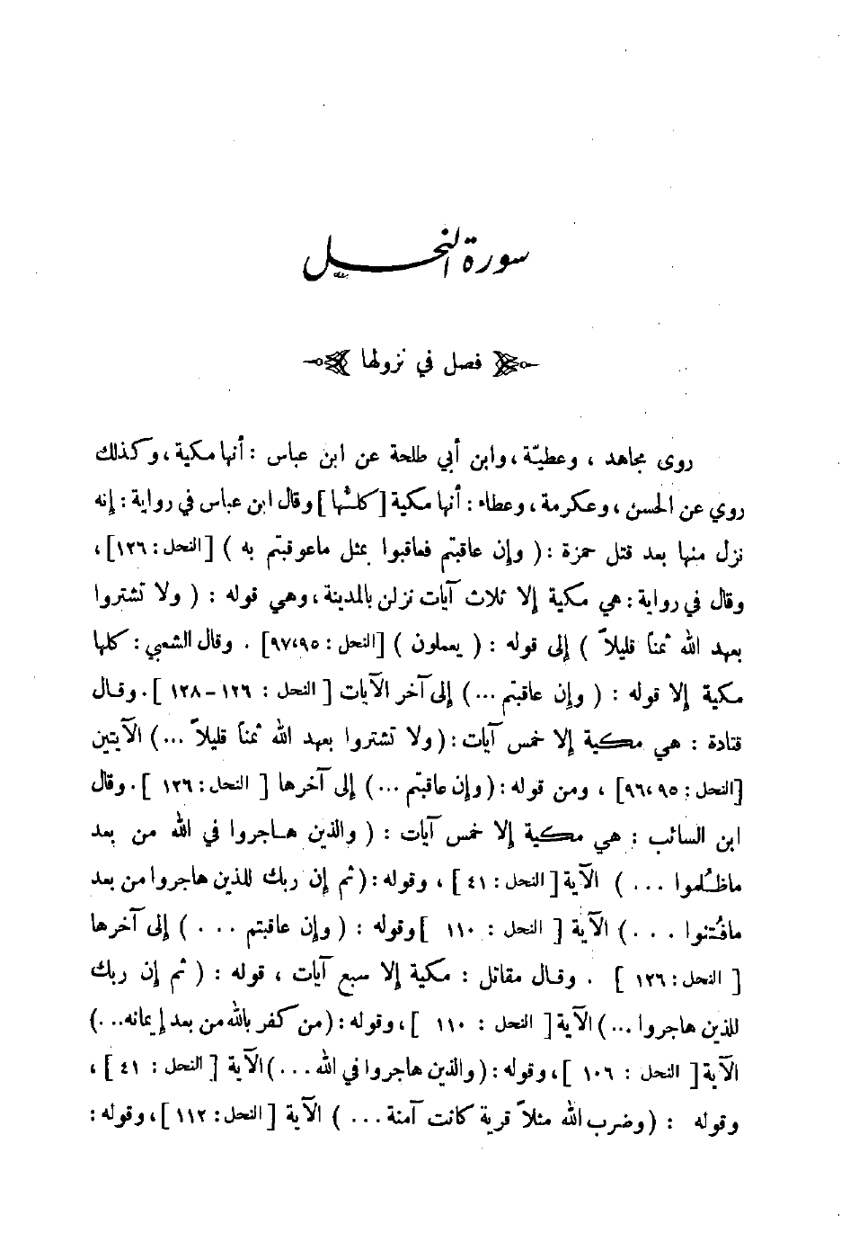 روى مجاهد وعطية وابن أبي طلحة عن ابن عباس أنها مكية وكذلك روي عن الحسن وعكرمة وعطاء أنهامكية كلها وقال ابن عباس في رواية إنه نزل منها بعد قتل حمزة وإن عاقتبم فعاقبوا بمثل ما عوقبتم به النحل 126 وقال في رواية هي مكية إلا ثلاث آيات نزلن بالمدينة وهي قوله ولا تشتروا بعهد الله ثمنا قليلا إلى قوله يعملون النحل 9597 وقال الشعبي كلها مكية إلى قوله وإن عاقبتم إلى آخر الآيات النحل 126 128 وقال قتادة هي مكية إلاخمس آيات ولا تشتروا بعهد الله ثمنا قليلا الآيتين النحل 9596 ومن قوله وإن عاقبتم إلى آخرها النحل 126 وقال ابن السائب هي مكية إلا خمس آيات والذين هاجروا في الله من بعد ما ظلموا الآية النحل 41 وقوله ثم إن ربك للذين هاجروا من بعد ما فتنوا الآية النحل 110 وقوله وإن عاقبتم إلى آخرها النحل 126 وقال مقاتل مكية إلا سبع آيات قوله ثم إن ربك للذين هاجروا الآية النحل 110 وقوله من كفر بالله من بعد إيمانه الآية النحل 106 وقوله والذين هاجروا في الله الآية النحل 41 وقوله وضرب الله مثلا قرية كانت آمنة الآية النحل 112 وقوله