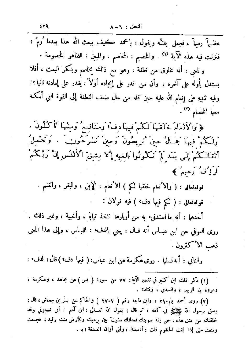 والمعنى أنه مخلوق من نطفة وهو مع ذلك يخاصم وينكر البعث أفلا يستدل بأولة على آخرة وأن من قدر على إيجادة أولا يقدر على إعادتة ثانية وفية تنبية علي إنعام اللة علية حين نقلة من حال ضعف النطفة إلى القوة التي أمكنة معها الخصام والأنعام خلقها لكم فيها دف ومنافع ومنها تأكلون ولكم فيها جمال حين تريحون وحين تسرحون وتحمل أثقالكم إلي بلد لم تكونوا بالغية إلا بشق الأنفس إن ربكم لرؤف رحيم قولة تعالي والأنعام خلقها لكم الأنعام الإبل والبقر والغنم