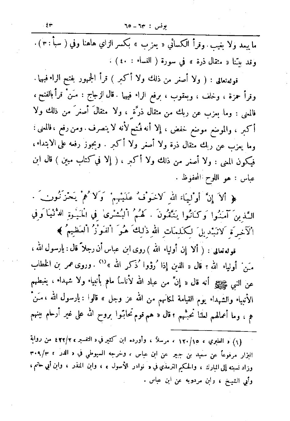 قوله تعالى ولا أصغر من ذلك ولا أكبر قرأ الجمهور بفتح الراء فيهما وقرأ حمزة وخلف ويعقوب برفع الراء فيهما قال الزجاج من قرأ بالفتح فالمعنى وما يعزب عن ربك من مثقال ذرة ولا مثقال أصغر من ذلك ولا أكبر والموضع موضع خفض إلا أنه فتح لأنه لا ينصرف ومن رفع فالمعنى وما يعزب عن ربك مثقال ذرة ولا أصغر ولا أكبر ويجوز رفعه على الابتداء فيكون المعنى ولا أصغر من ذلك ولا أكبر إلا في كتاب مبين قال ابن عباس هو اللوح المحفوظ ألا إن أولياء الله لا خوف عليهم ولا هم يحزنون الذين آمنوا وكانوا يتقون لهم البشرى في الحيوة الدنيا وفي الآخرة لا تبديل لكلمات الله ذلك هو الفوز العظيم