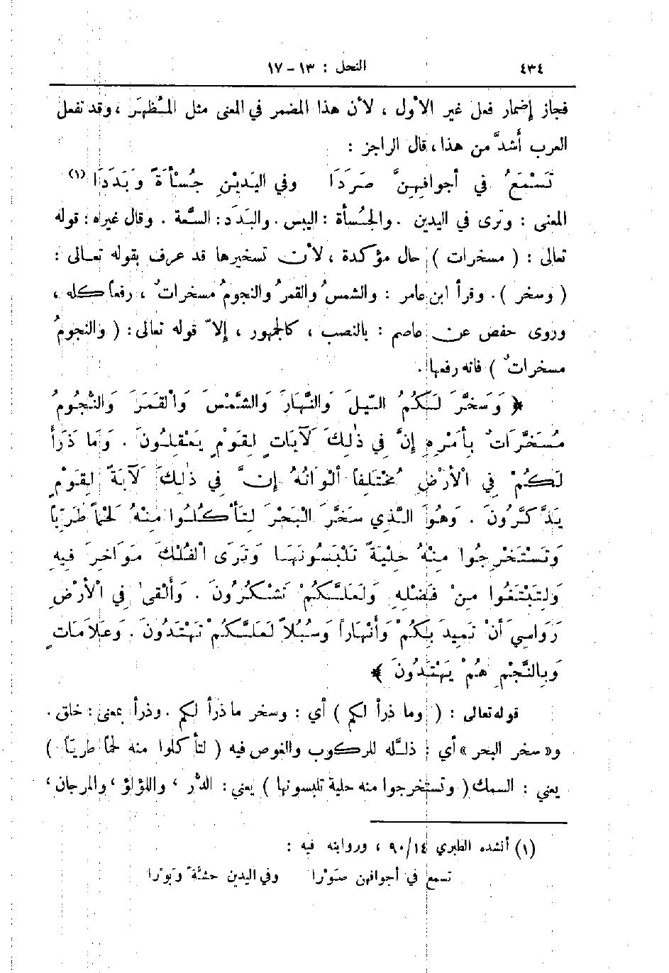 المعنى وترى في اليدين والجسأة اليبس والبدد السعة وقال غيره قوله تعالى مسخرات حال مؤكدة لأن تسخيرها قد عرف بقوله تعالى وسخر وقرأ ابن عامر والشمس والقمر والنجوم مسخرات رفعا كله وروى حفص عن عاصم بالنصب كالجمهور إلا قوله تعالى والنجوم مسخرات فإنه رفعها وسخر لكم اليل والنهار والشمس والقمر والنجوم مسخرات بأمره إن في ذلك لآيات لقوم يعقلون وما ذرأ لكم في الأرض مختلفا ألوانه إن في ذلك لآية لقوم يذكرون وهو الذي سخر البحر لتأكلوا منه لحما طريا وتستخرجوا منه حلية تلبسونها وترى الفلك مواخر فيه ولتبتغوا من فضله ولعلكم تشكرون وألقى في الأرض رواسي أن تميد بكم وأنهارا وسبلا لعلكم تهتدون وعلامات وبالنجم هم يهتدون