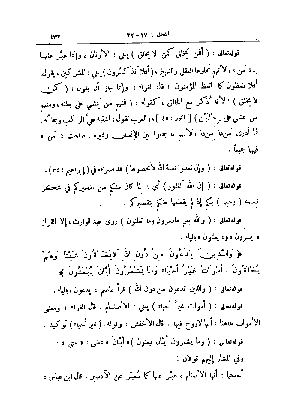 قوله تعالى والله يعلم ما تسرون وما تعلنون روى عبد الوارث إلا القزاز يسرون و يعلنون بالياء والذين يدعون من دون الله لا يخلقون شيئا وهم يخلقون أموات غير أحياء وما يشعرون أيان يبعثون