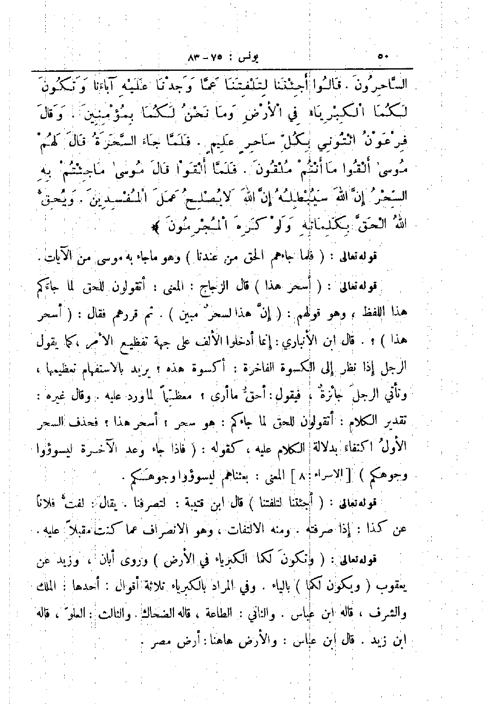 الساحرون قالوا أجئتنا لتلفتنا عما وجدنا عليه آباءنا وتكون لكما الكبرياء في الأرض وما نحن لكما بمؤمنين وقال فرعون ائتوني بكل ساحر عليم فلما جاء السحرة قال لهم موسى ألقوا ما أنتم ملقون فلما ألقوا قال موسى ما جئتم به السحر إن الله سيبطله إن الله لا يصلح عمل المفسدين ويحق الله الحق بكلماته ولو كره المجرمون