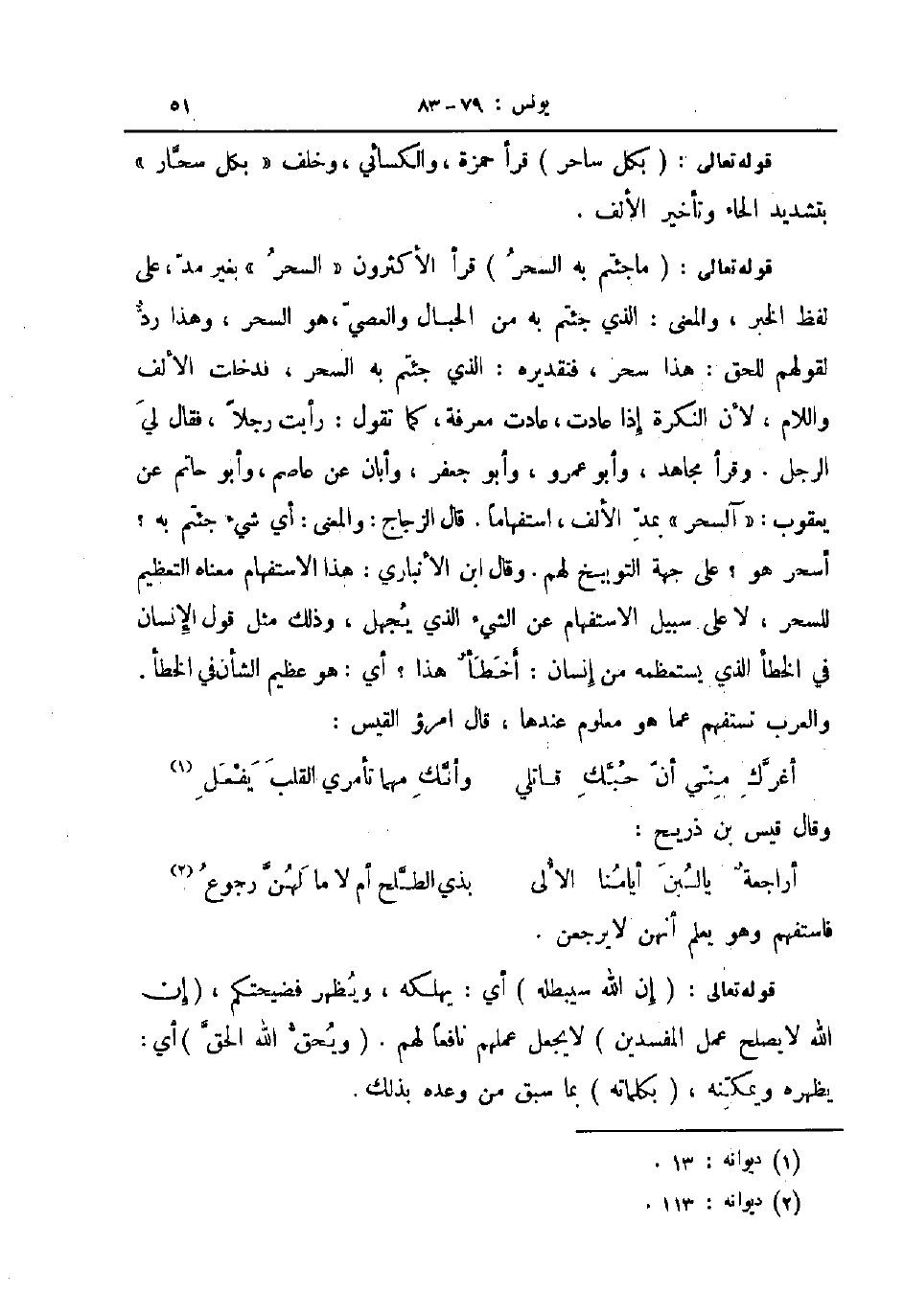 قوله تعالى ما جئتم به السحر قرأ الأكثرون السحر بغير مد على لفظ الخبر والمعنى الذي جئتم به من الحبال والعصي هو السحر وهذا رد لقولهم للحق هذا سحر فتقديره الذي جئتم به السحر فدخلت الألف واللام لأن النكرة إذا عادت عادت معرفة كما تقول رايت رجلا فقال لي الرجل وقرأ مجاهد وأبو عمرو وأبو جعفر وابان عن عاصم وأبو حاتم عن بعقوب آلسحر بمد الألف استفهاما قال الزجاج والمعنى أي شيء جئتم به أسحر هو على جهة التوبيخ لهم وقال ابن الأنباري هذا الاستفهام معناه التعظيم للسحر لا على سبيل الاستفهام عن الشيء الذي يجهل وذلك مثل قول الإنسان في الخطأ الذي يستعظمه من إنسان أخطأ هذا أي هو عظيم الشأن في الخطأ والعرب تستفهم عما هو معلوم عندها قال امرؤ القيس ... أغرك مني أن حبك قاتلي ... وأنك مهما تأمري القلب يفعل ...