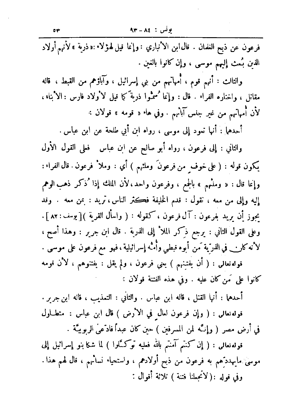 والثاني إلى فرعون رواه أبو صالح عن ابن عباس فعلى القول الأول يكون قوله على خوف من فرعون وملئهم أي وملأ فرعون قال الفراء وإنما قال وملئهم بالجمع وفرعون واحد لأن الملك إذا ذكر ذهب الوهم إليه وإلى من معه تقول قدم الخليفة فكثر الناس تريد بمن معه وقد يجوز أن يريد بفرعون آل فرعون كقوله واسأل القرية يوسف 82 وعلى القول الثاني يرجع ذكر الملأ إلى الذرية قال ابن جرير وهذا أصح لأنه كان في الذرية من أبوه قبطي وأمه إسرائيلية فهو مع فرعون على موسى