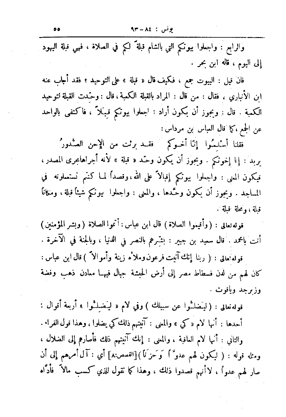 فإن قيل البيوت جمع فكيف قال قبلة على التوحيد فقد أجاب عنه ابن الأنباري فقال من قال المراد بالقبلة الكعبة قال وحدت القبلة لتوحيد الكعبة قال ويجوز أن يكون أراد اجعلوا بيوتكم قبلا فاكتفى بالواحد عن الجمع كما قال العباس بن مرداس ... فقلنا أسلموا إنا أخوكم ... فقد برئت من الإحن الصدور ...