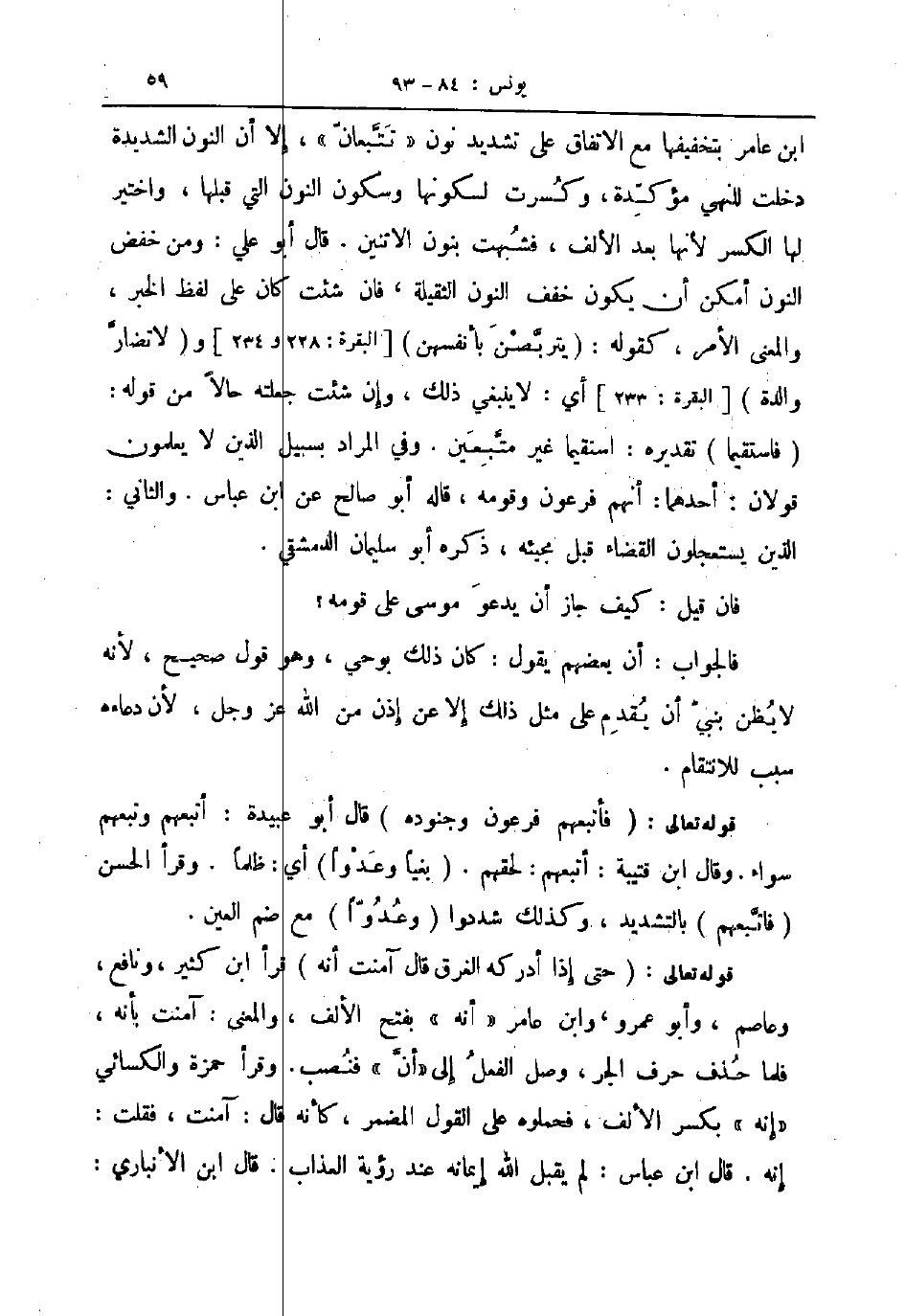 ابن عامر بتخفيفها مع الاتفاق على تشديد نون تتبعان إلا أن النون الشديدة دخلت للنهي مؤكدة وكسرت لسكونها وسكون النون التي قبلها واختير لها الكسر لأنها بعد الألف فشبهت بنون الاثنين قال أبو علي ومن خفض النون أمكن أن يكون خفف النون الثقيلة فإن شئت كان على لفظ الخبر والمعنى الأمر كقوله يتربصن بأنفسهن البقرة 228 و 234 و لاتضار والدة البقرة 233 أي لا ينبغي ذلك وإن شئت جعلته حالا من قوله فاستقيما تقديره استقيما غير متبعين وفي المراد بسبيل الذين لا يعلمون قولان أحدهما أنهم فرعون وقومه قاله أبو صالح عن ابن عباس والثاني الذين يستعجلون القضاء قبل مجيئه ذكره أبو سليمان الدمشقي