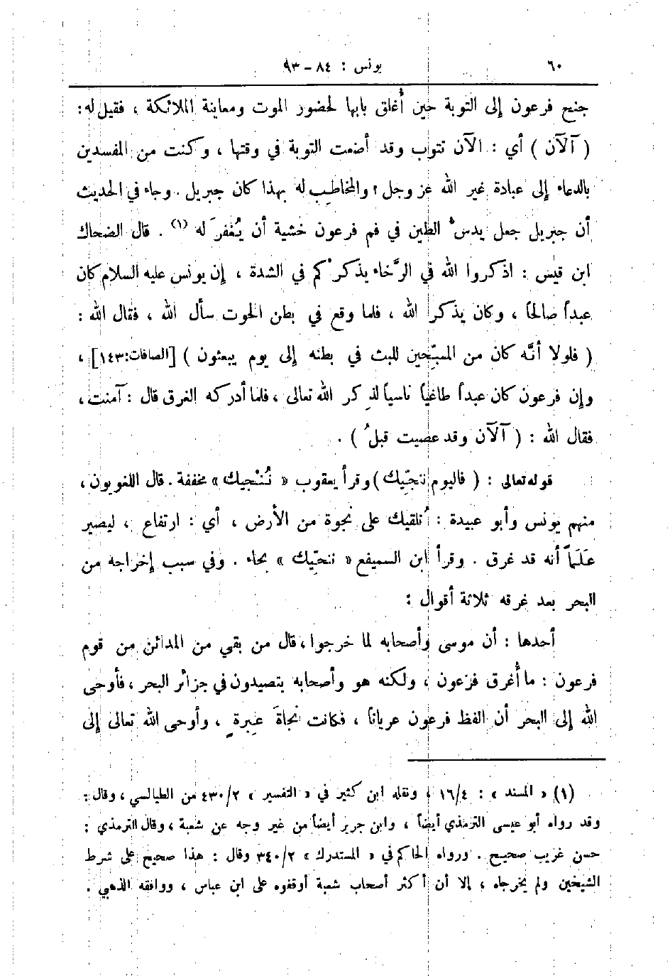 جنح فرعون إلى التوبة حين أغلق بابها لحضور الموت ومعاينة الملائكة فقيل له آلآن أي الآن تتوب وقد أضعت التوبة في وقتها وكنت من المفسدين بالدعاء إلى عبادة غير الله عز و جل والمخاطب له بهذا كان جبريل وجاء في الحديث أن جبريل جعل يدس الطين في فم فرعون خشية أن يغفر له قال الضحاك ابن قيس اذكروا الله في الرخاء يذكركم في الشدة إن يونس عليه السلام كان عبدا صالحا وكان يذكر الله فلما وقع في بطن الحوت سأل الله فقال الله فلولا أنه كان من المسبحين للبث في بطنه إلى يوم يبعثون الصافات 143 وإن فرعون كان عبدا طاغيا ناسيا لذكر الله تعالى فلما أدركه الغرق قال آمنت فقال الله آلهان وقد عصيت قبل